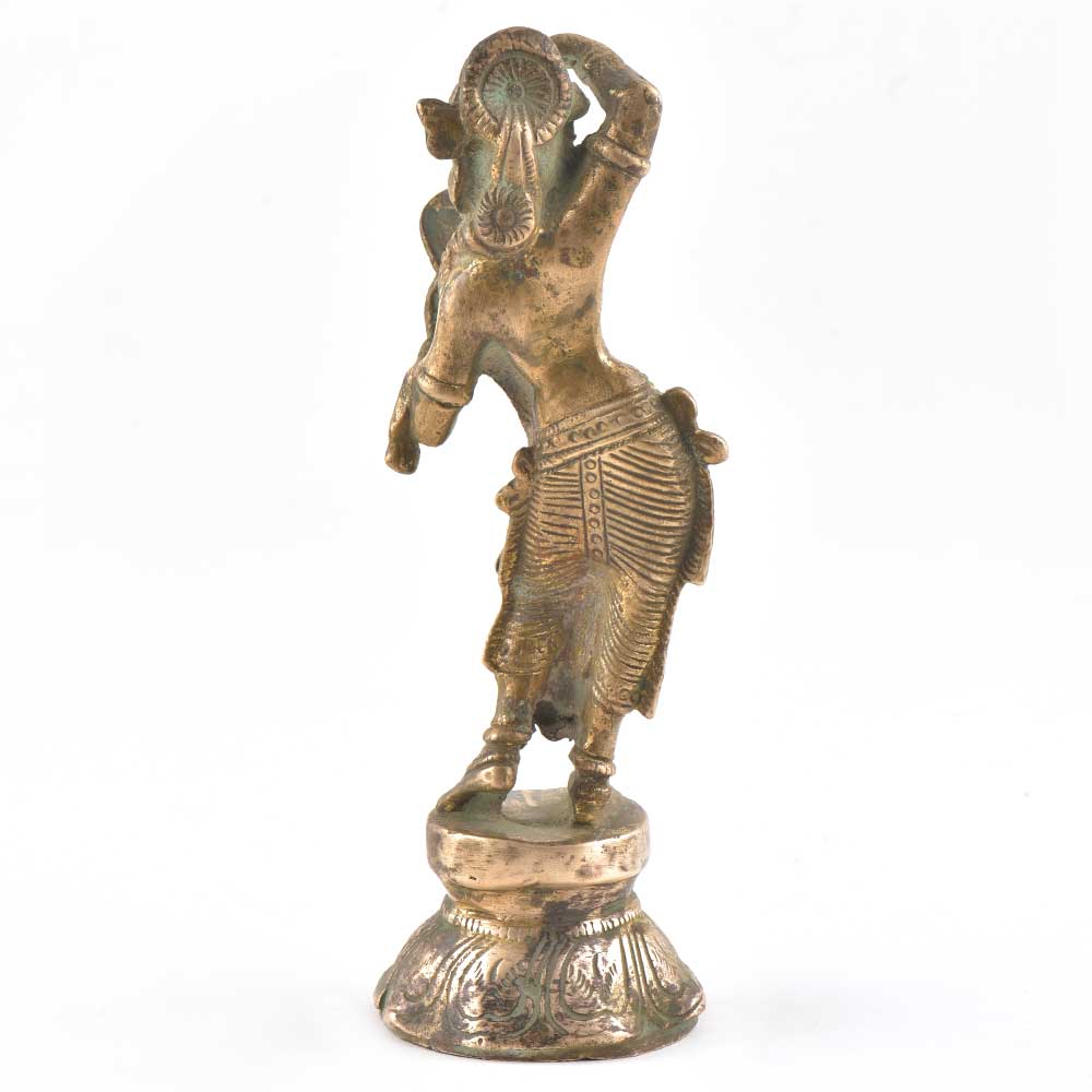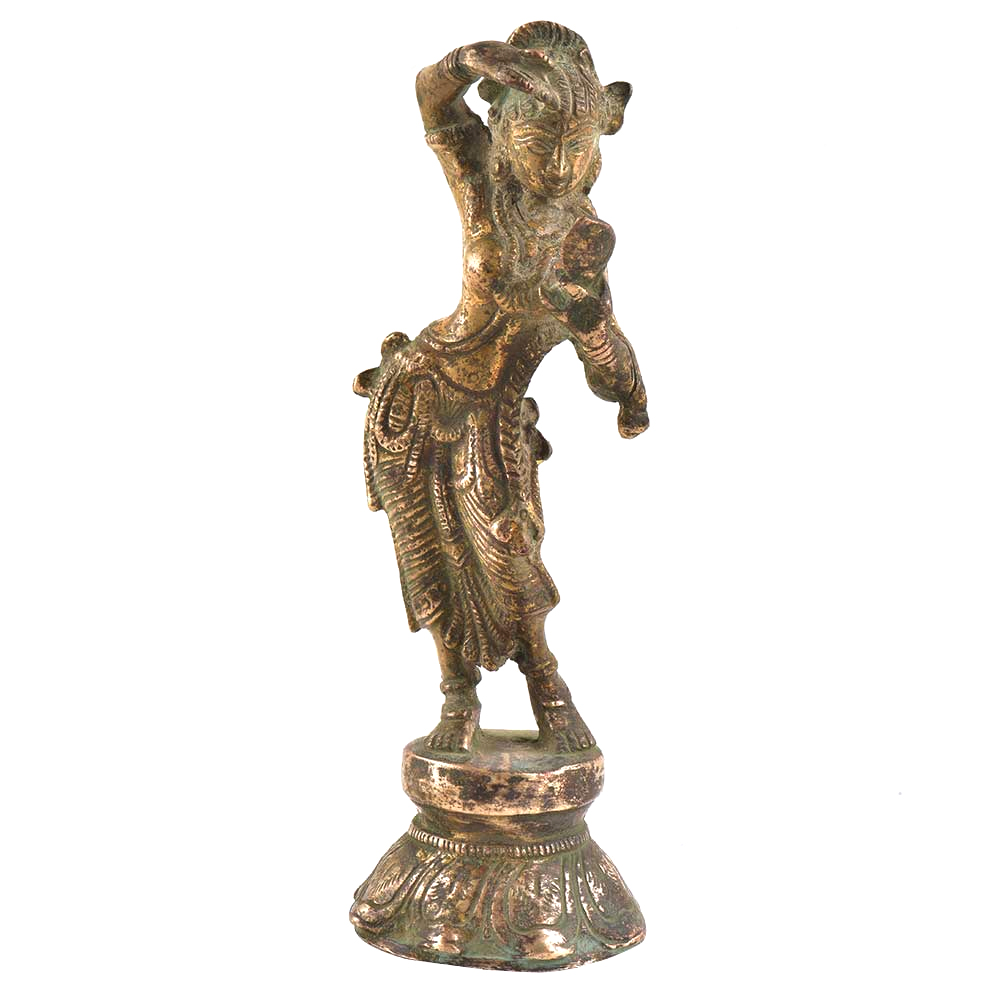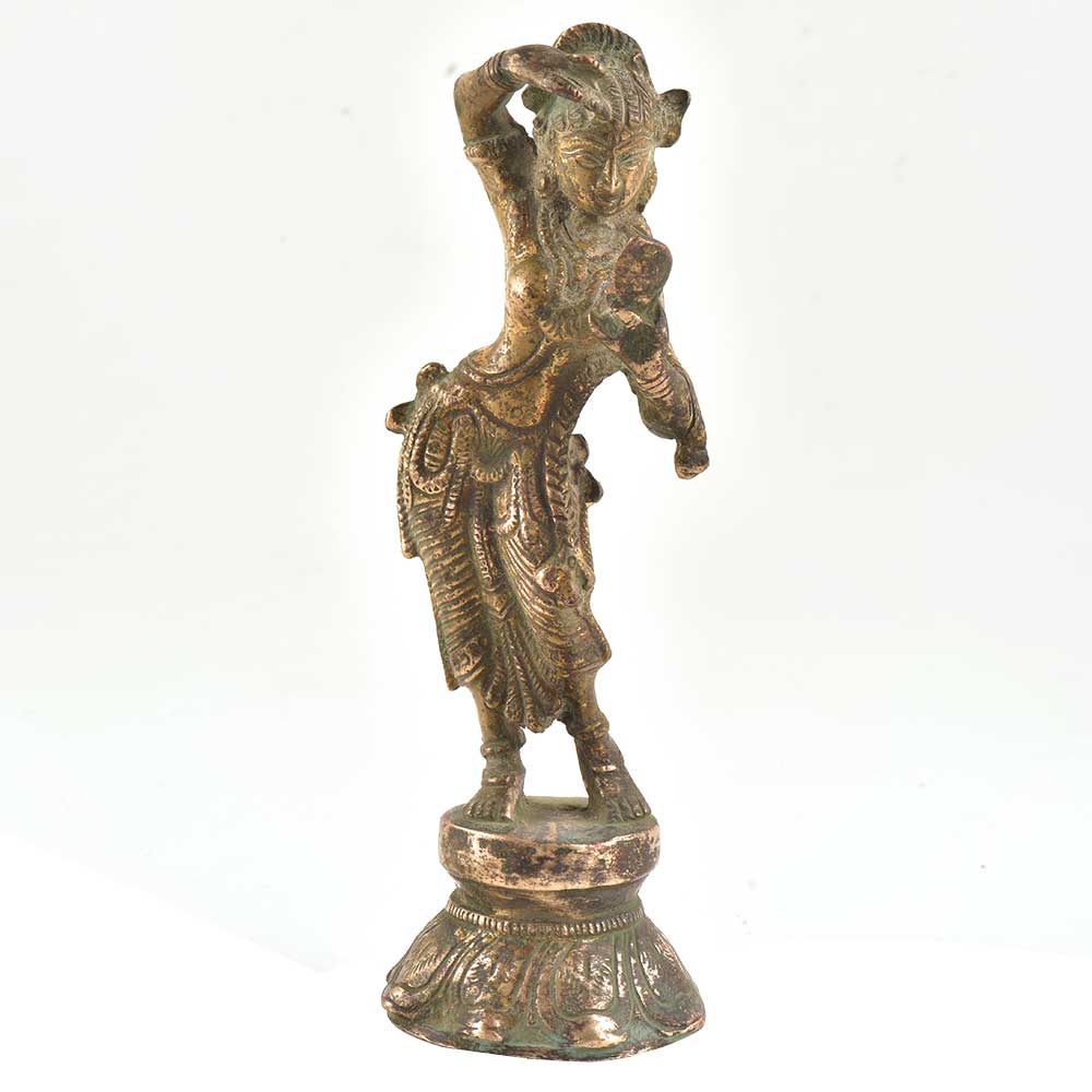The bronze lady Statue shows a dancing lady from Khajuraho w ith a mirror in one hand and applying vermillion from the other.The khajuraho maiden is possessed by celestial powers .The statue has geeater perspective for the human eye and the detailing on the statue enhances the physical form of the apsara or maiden. A lovely home decor statue.