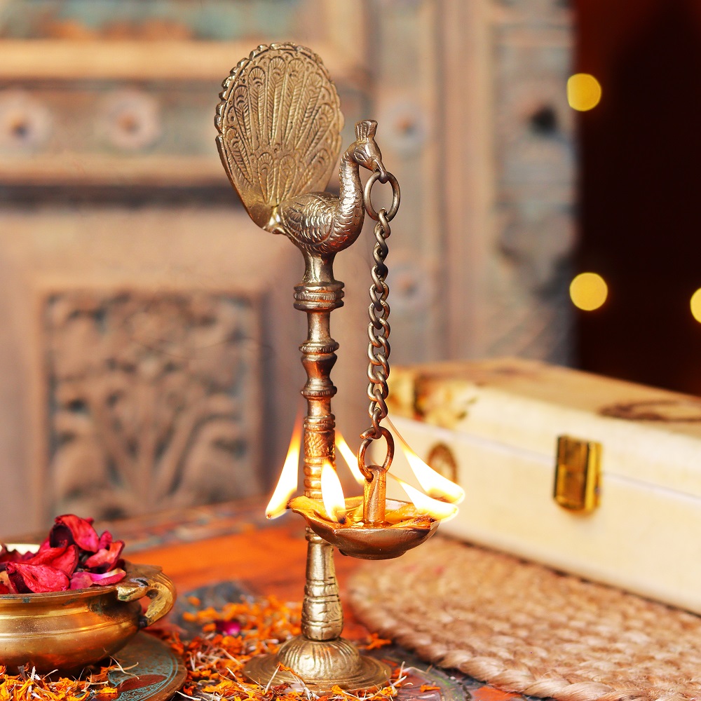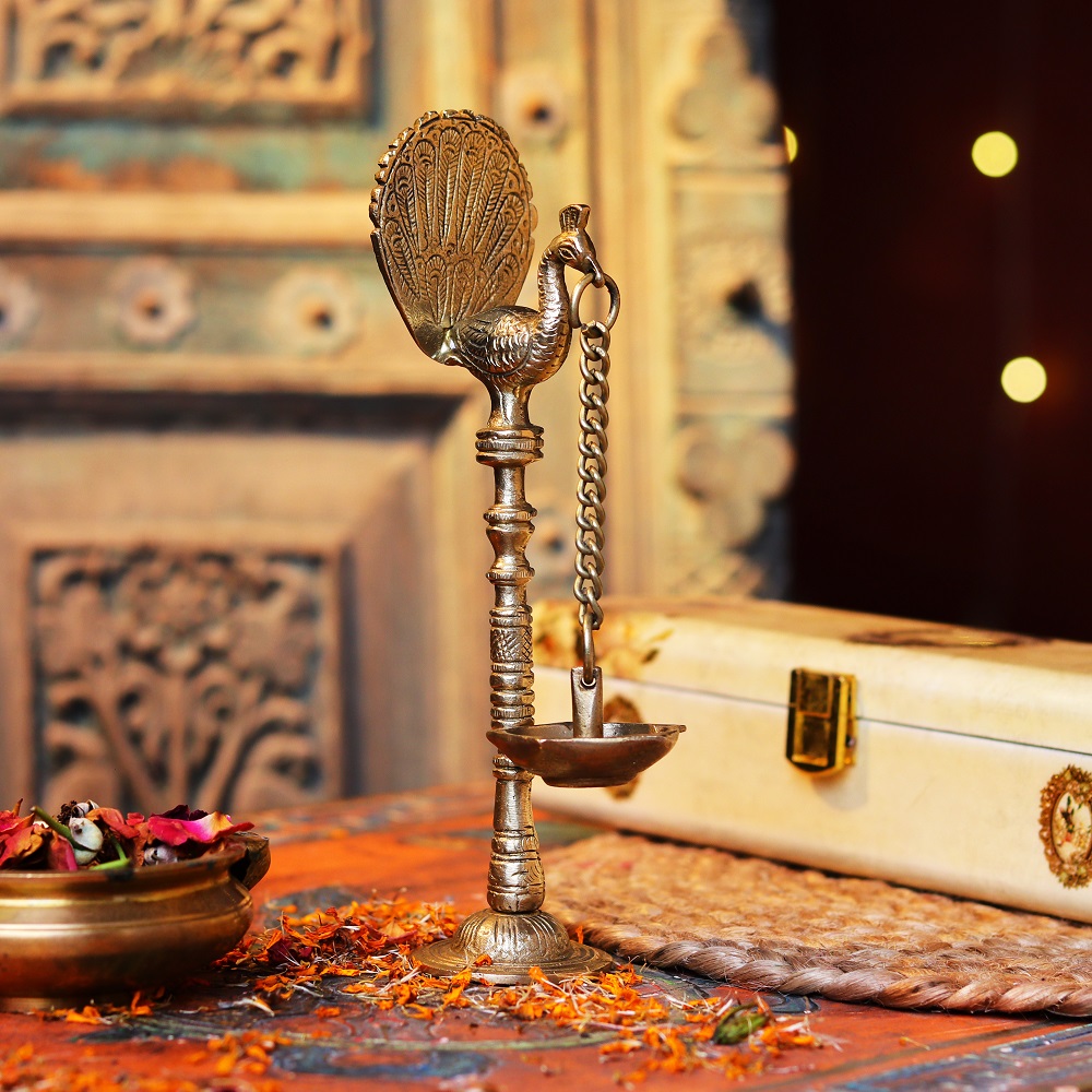 This Brass Kuthu Villaku Peacock Hanging Oil Lamp makes a thoughtful and meaningful gift for housewarmings, weddings, or special occasions. Its traditional design and spiritual significance make it a perfect gift for friends and family, adding both beauty and blessings to their homes.