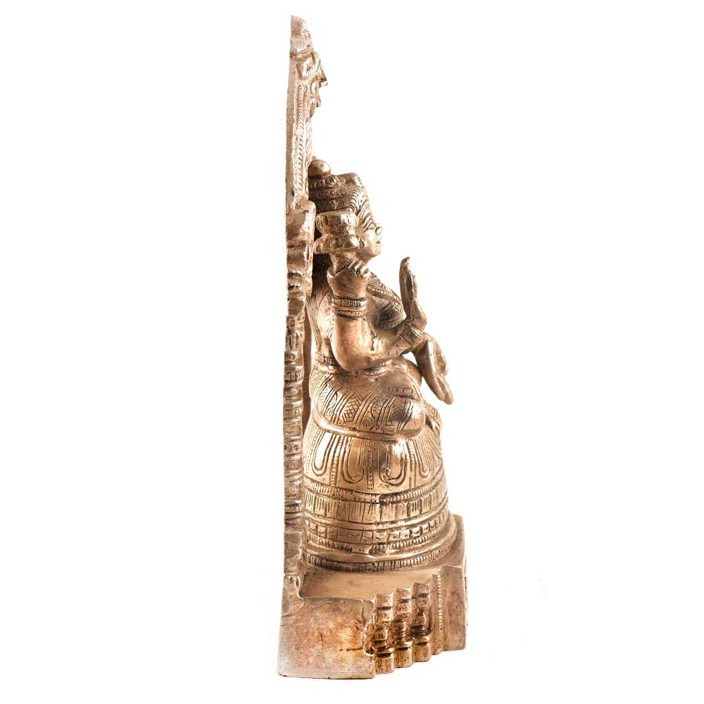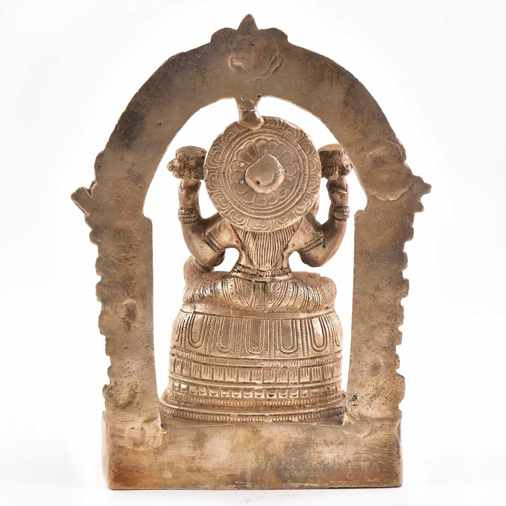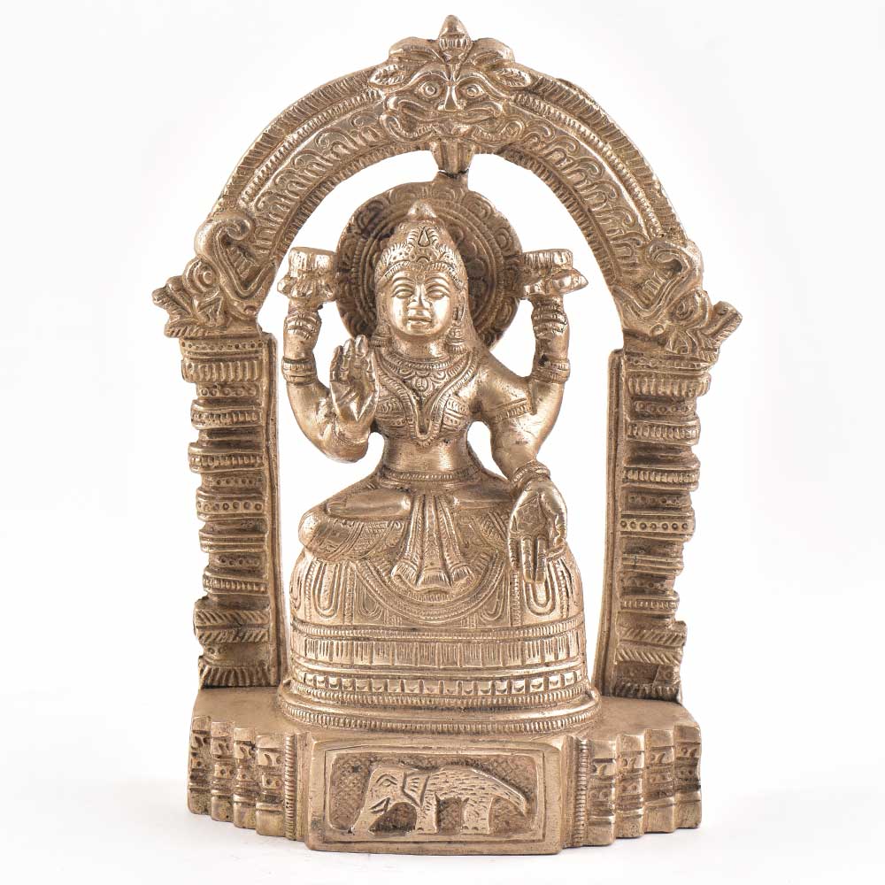 The beautiful Lakshmi sits holding two lotus flowers, a symbol of beauty, prosperity and fertility, with her other two hands in the abhaya mudra showing her devotees that have nothing to fear from the goddess of wealth Lakshmi has an elaborate arch behind her which sets this piece apart from others. It is complete with two yalis on either side of her and Mahakala or "great time" above her head.