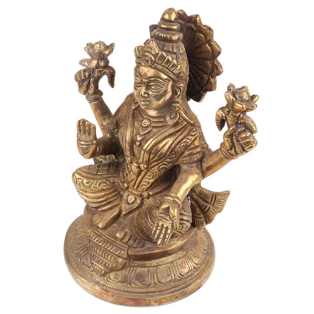 Brass Laxmi Statue sitting on a lotus base with four hands the hands on the back has lotus flower. The hands on front has pot with coin spread on the goddess palms . The other hand show the goddess blessing her followers. Use it yourself in your poja room, in hotels, restaurants, Schools Etc. Gift it to your near and dear ones on Diwali, new year, wedding, house warming, and birthday gift .