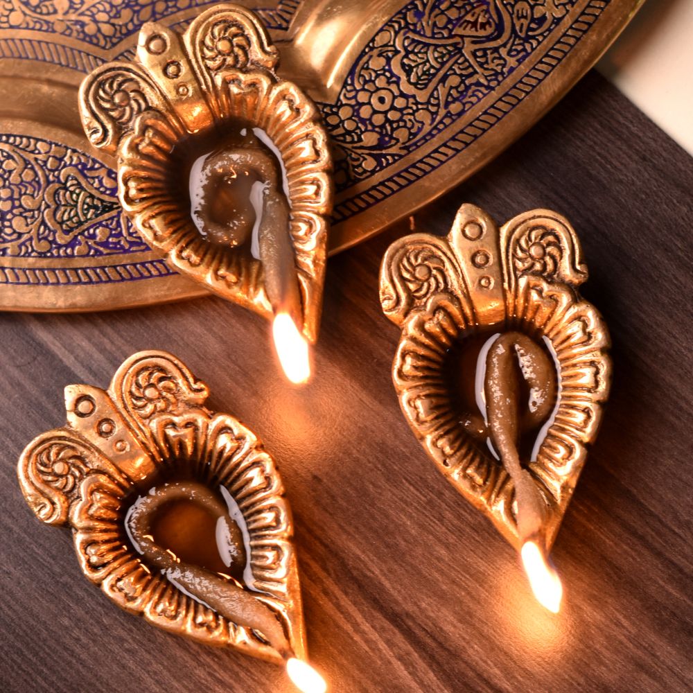 Bring elegance and auspicious energy to your home with this Brass Leaf Shaped Diya with Intricate Design. Handcrafted from solid brass with a radiant golden finish, it features fine detailing that enhances both its beauty and sacred symbolism. Representing growth, purity, and prosperity, this diya is a perfect choice for Diwali lighting, mandir rituals, and festive gifting.