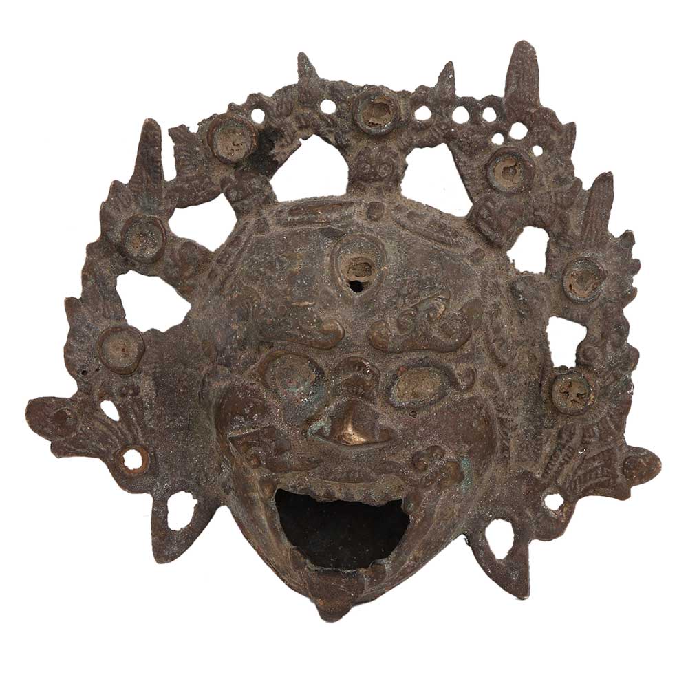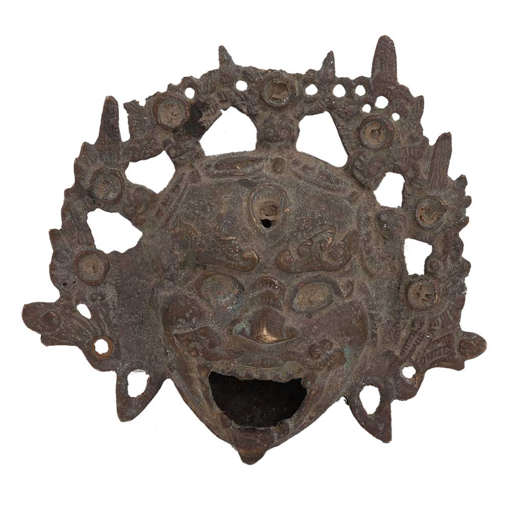 An old brass face of Chinese god with lion face and ornate crown with big eyes and mouth open in amazement. Home Decoration, office decoration, Wall hanging , Diwali Gift, House warming gift for your near and dear ones.