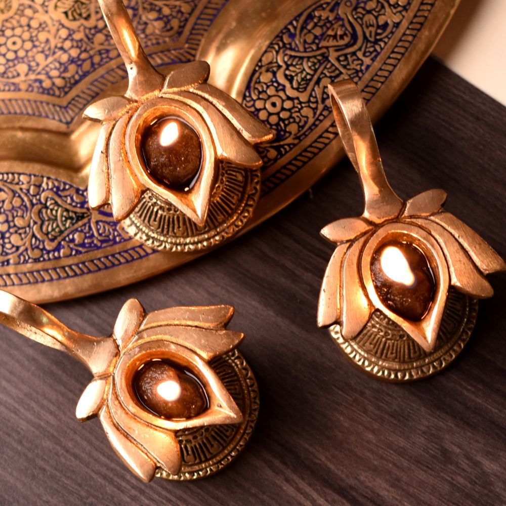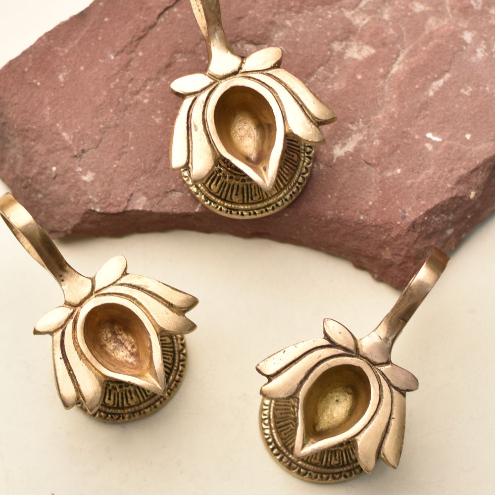 Illuminate your Diwali celebrations with this beautiful Brass Lotus Shape Diwali Diya with Handle - Pack of 3. Designed with traditional elegance and crafted from high-quality brass, these diyas are a perfect addition to your festive décor. The lotus-shaped design symbolizes purity, beauty, and spiritual awakening, making them ideal for lighting up your home during the festival of lights.