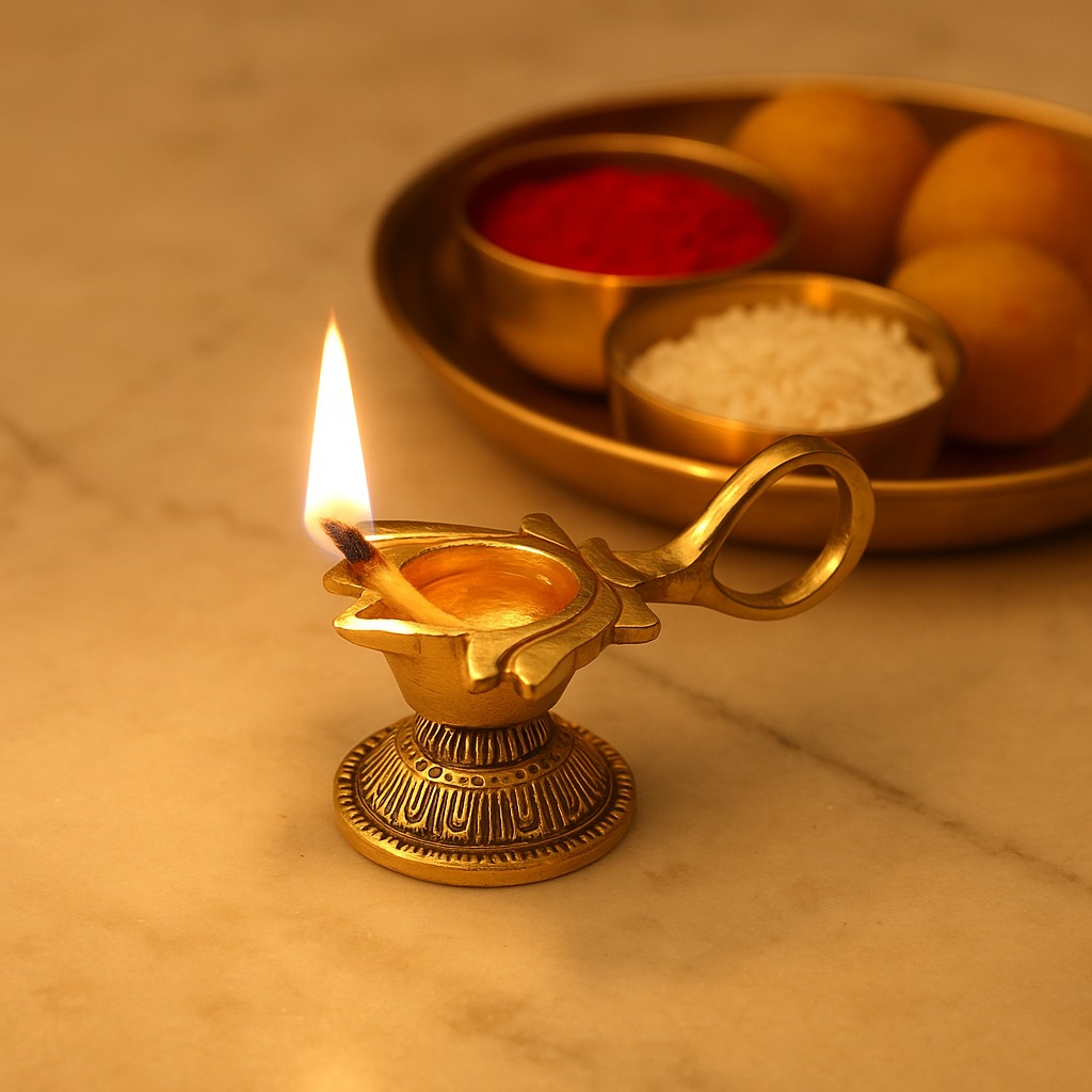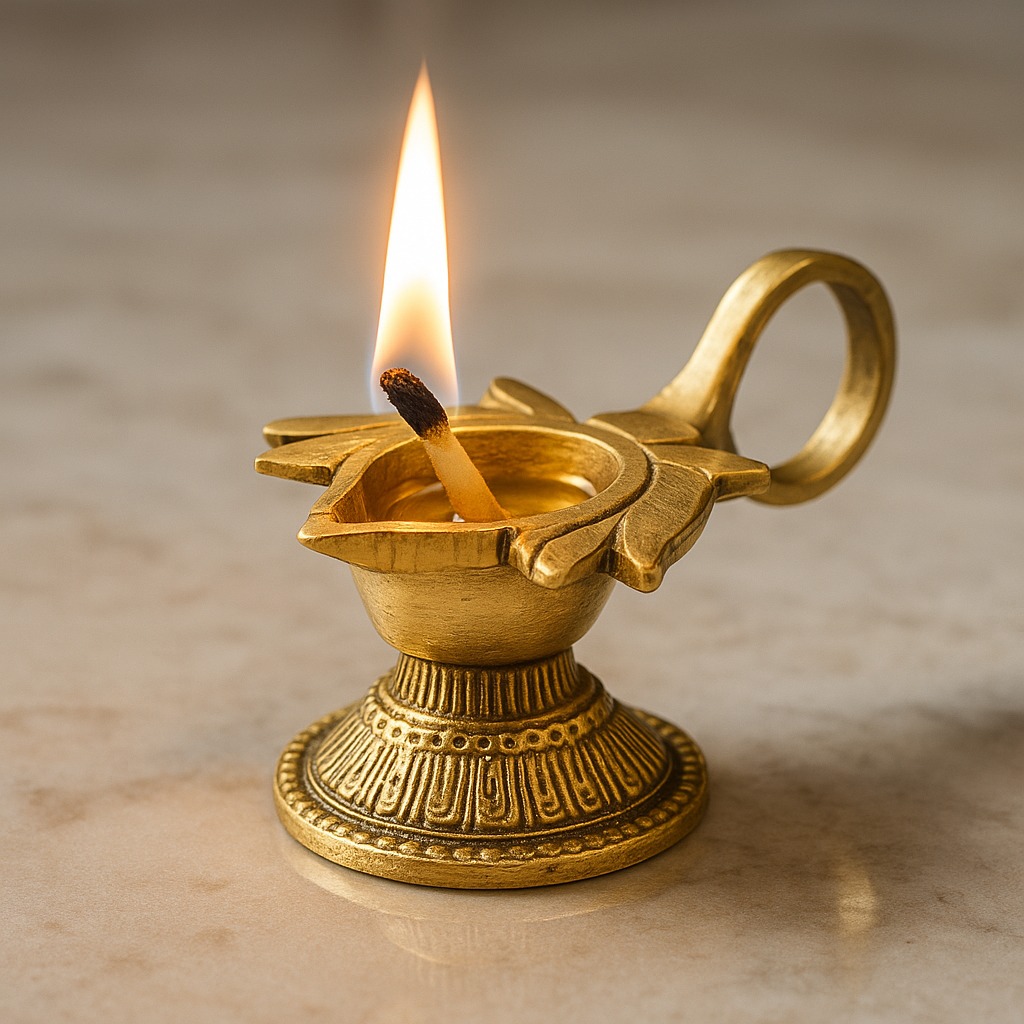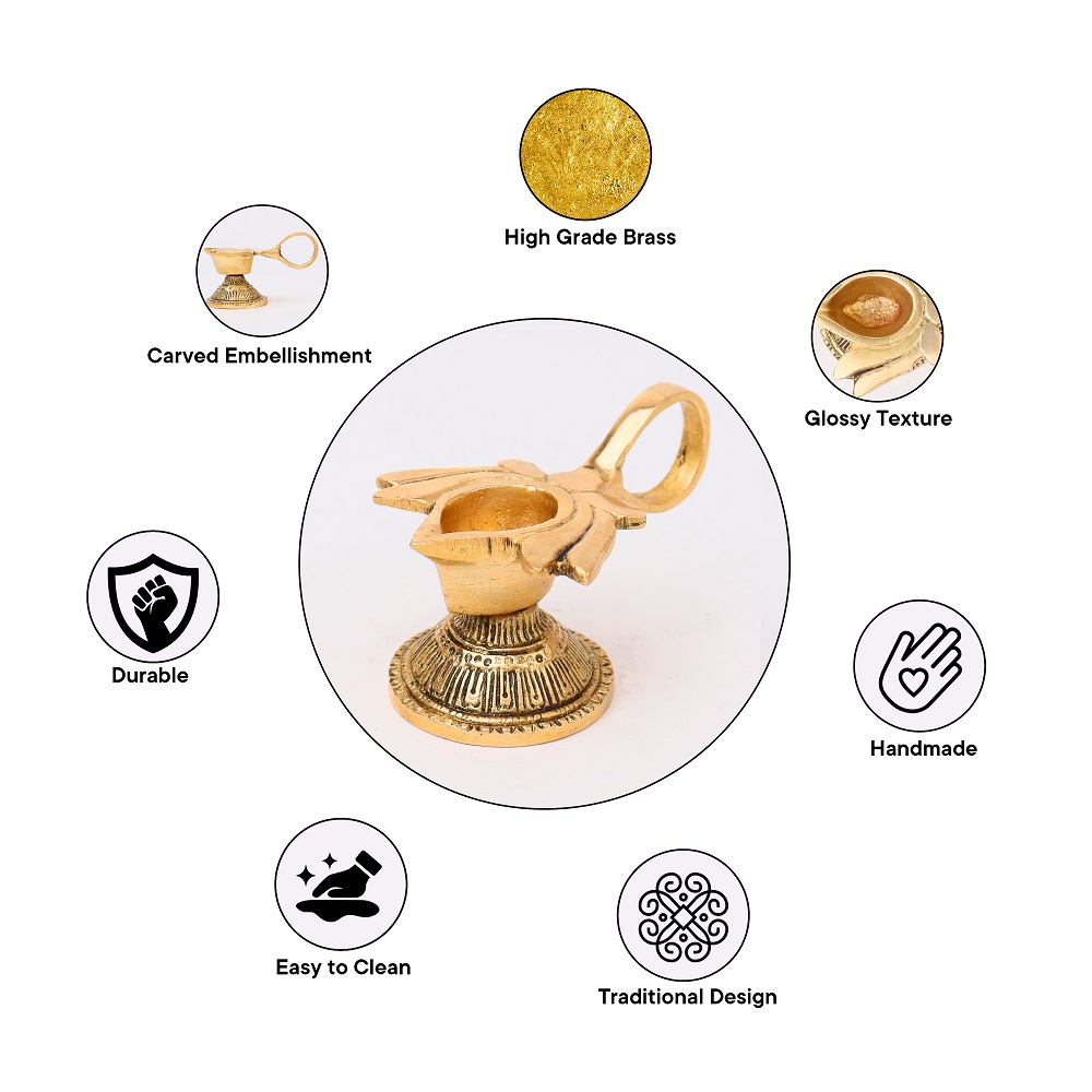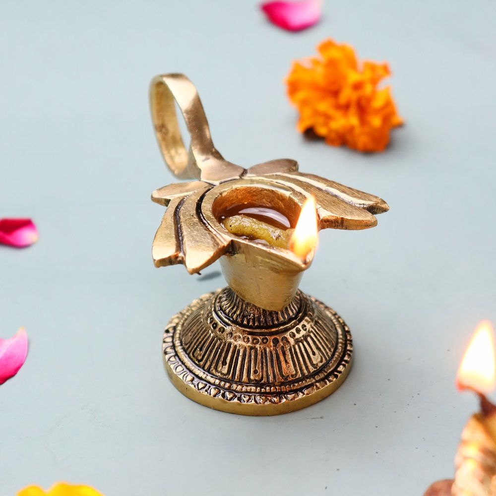 Light up your sacred spaces with the Brass Lotus Shape Oil Lamp on Stand with Handle, a handcrafted diya that beautifully combines devotion and artistry. Designed in the graceful form of a blooming lotus, this diya reflects purity and spiritual awakening. The sturdy brass stand ensures stability, while the easy-to-hold handle makes it functional and traditional at the same time. With its golden polish and intricate detailing, it’s an elegant centerpiece for daily puja rituals and festive celebrations.