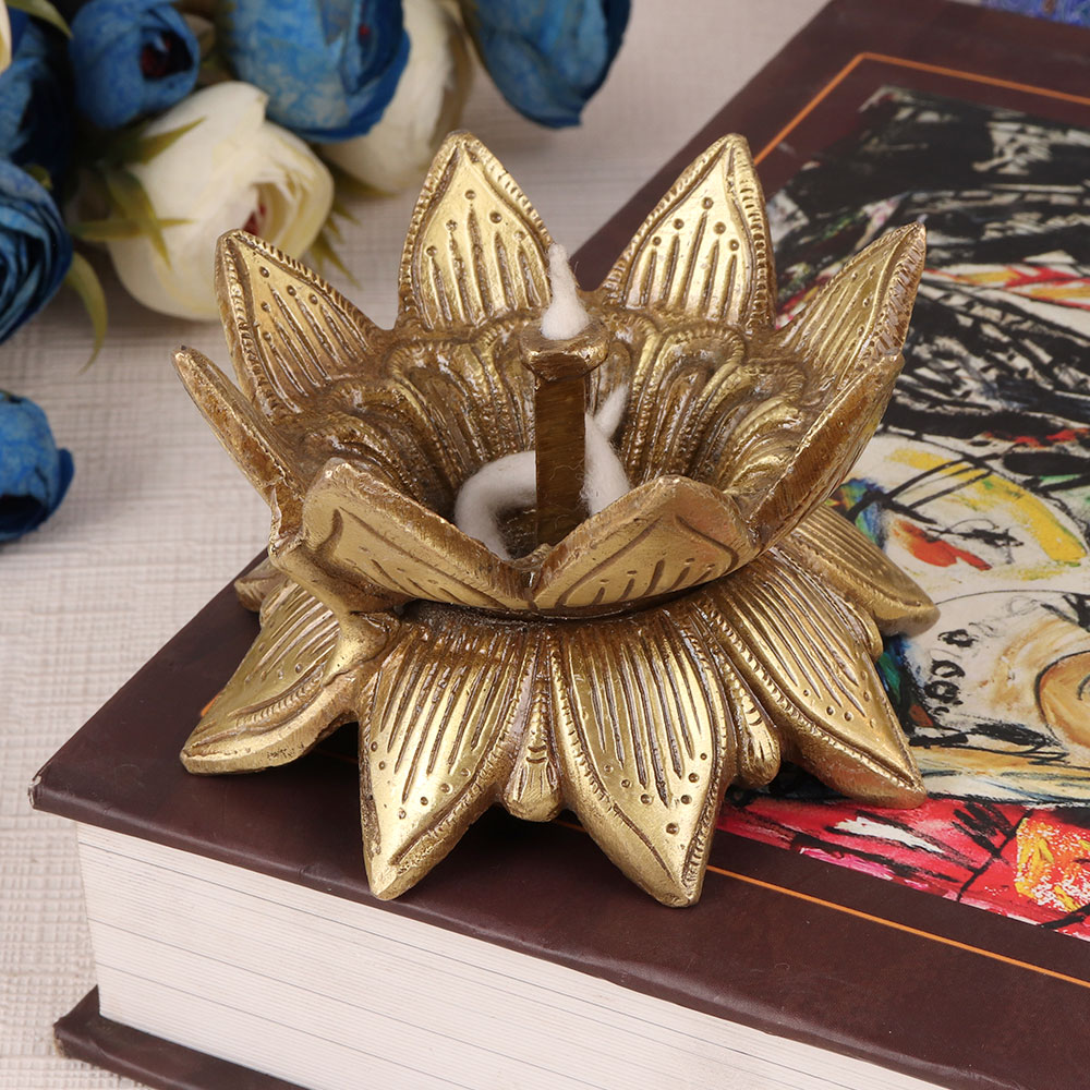 The brass oil lamp is an exquisite piece of art that is shaped like a lotus flower. This lamp is commonly used during special occasions and festivals to bring warmth and light to the festivities. The lamp is made from high-quality brass and has a shiny golden finish that adds to its elegance. It has a deep cavity to hold the oil or ghee and a cotton wick that burns brightly to emit a warm and soothing glow. The lamp is traditionally filled with mustard oil or desi ghee, which is believed to have purifying properties. It is a symbol of purity, enlightenment, and prosperity, and is often used during religious ceremonies and rituals. The brass oil lamp is a timeless classic that will add beauty and charm to any occasion. Gift this incredible oil lamp to your loved ones on special or festive occasions.