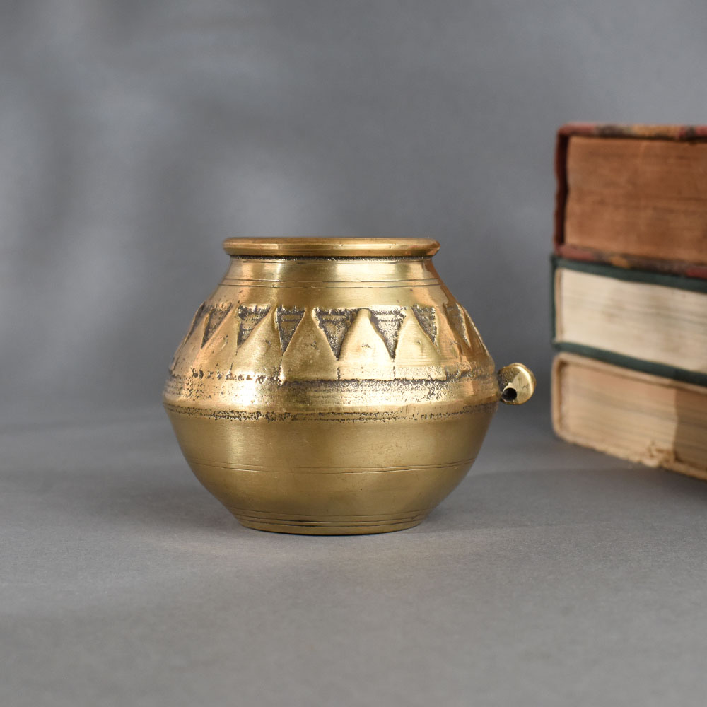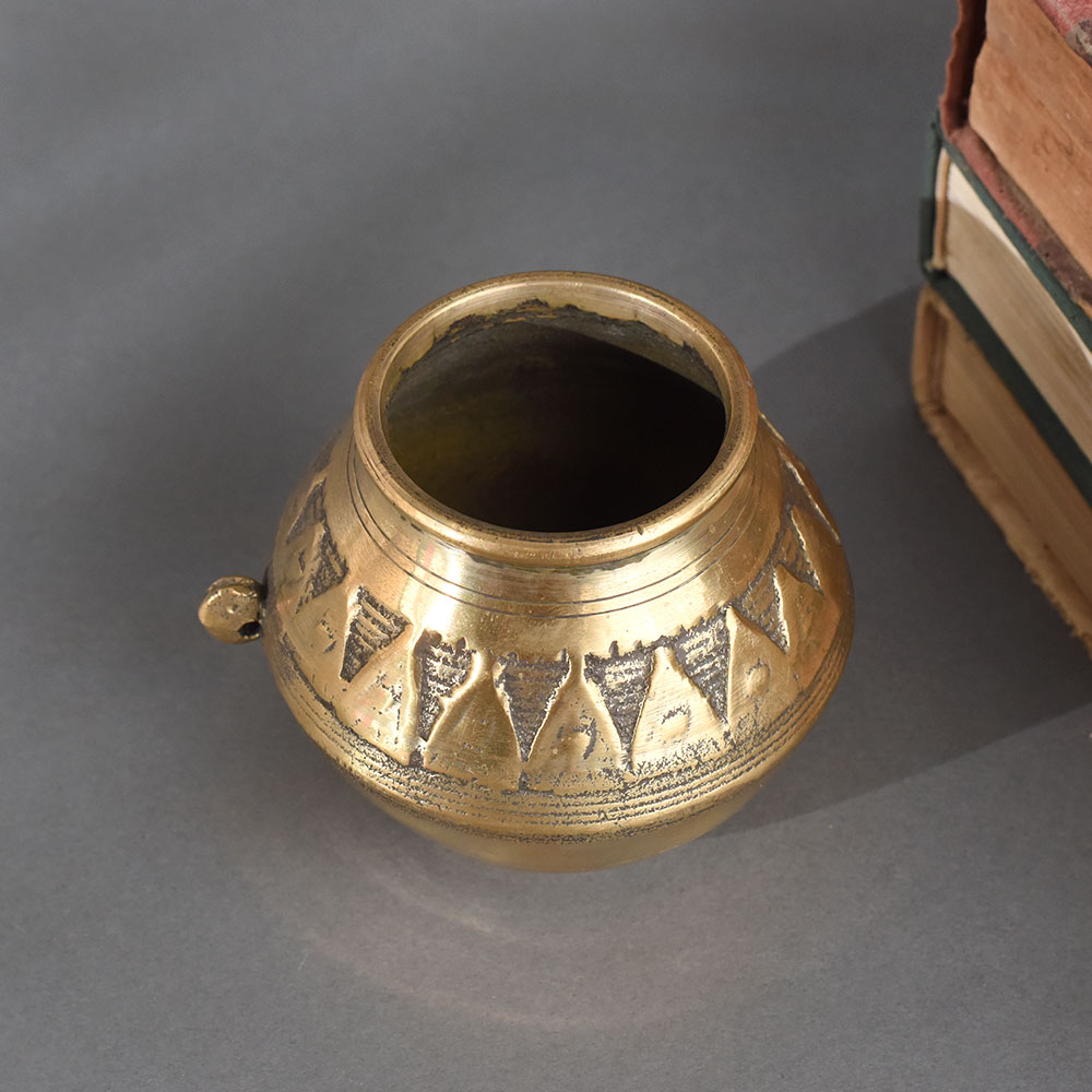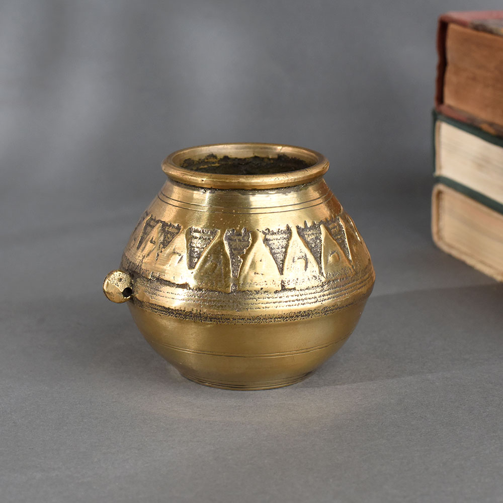 - Handcrafted brass pot featuring tribal-inspired triangle patterns
