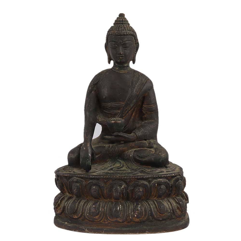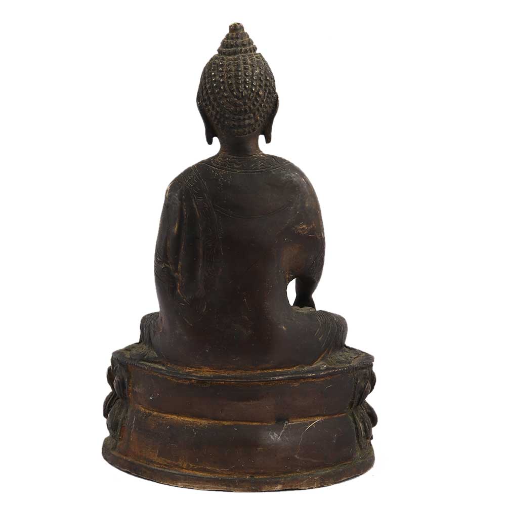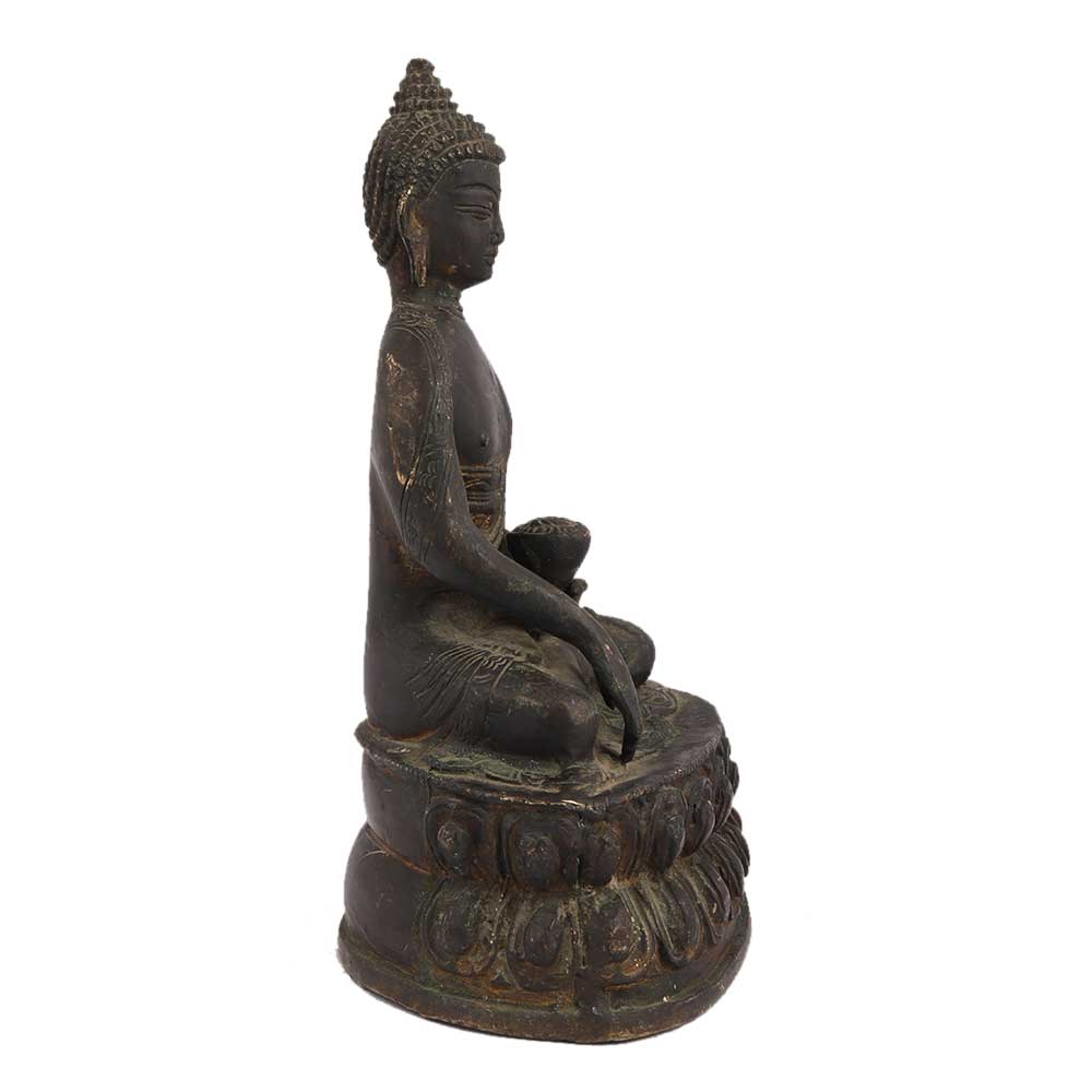Brass Meditating Buddha Sitting On Lotus Base has a very peaceful face with fine carvings on the robe . Place it on the desk of your office, study table or display unit of your living room. It comes in a black finish.