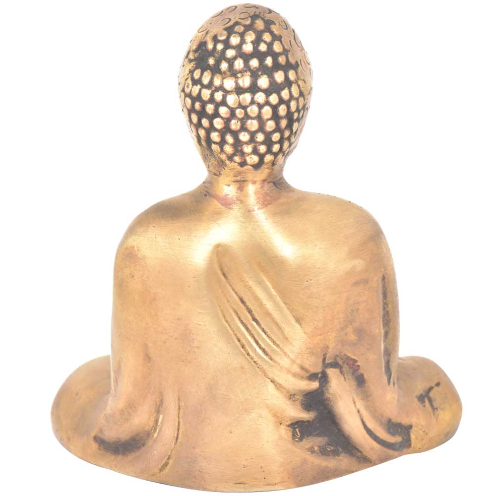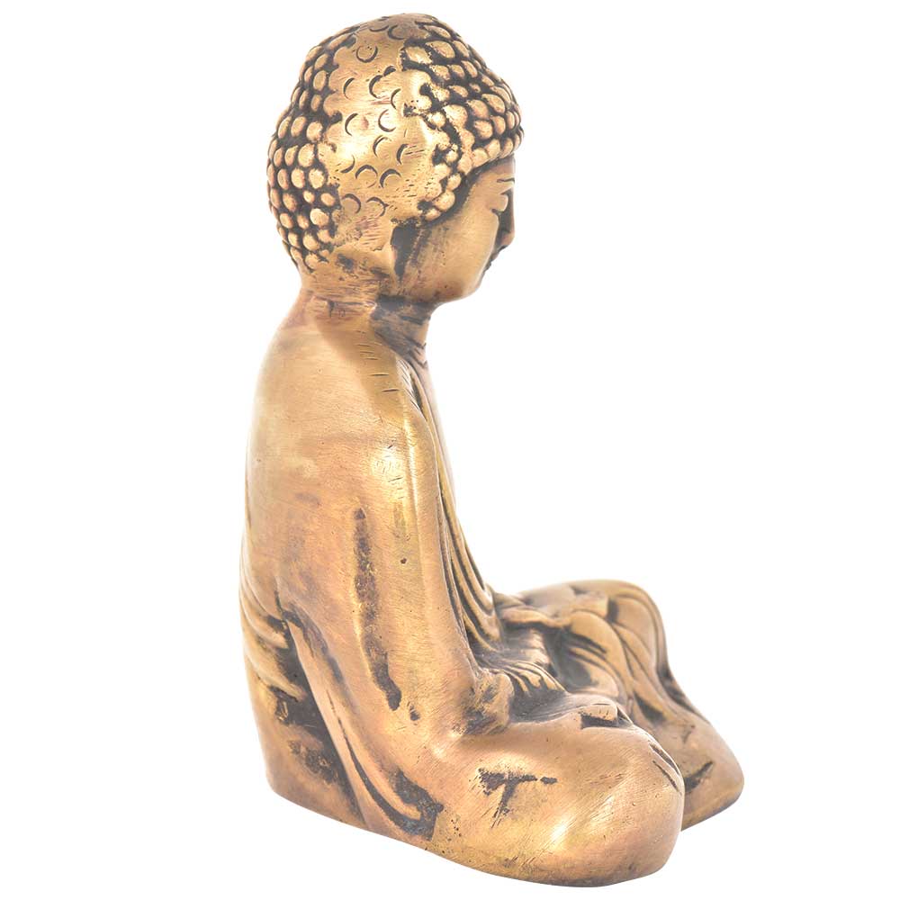 The Buddha is seated in the padmasana or full lotus position. It is a seated position of deep meditation. His right hand is held a little above his left as if it is on its way to resting in his lap. A beautiful sculpture of Lord Buddha! The statue has rich, antique, verde-gris patina which is typical of Indonesian brass statues. He peacefully sits on a black wood base that gives the sculpture a refined look.