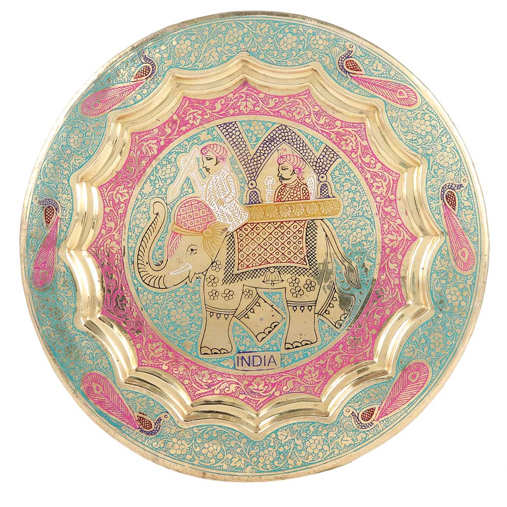 Beautiful gold Meenakari Elephant rider wall hanging plate with red, green, and blue accents. Very appealing, suitable for mounting in entryways and halls.