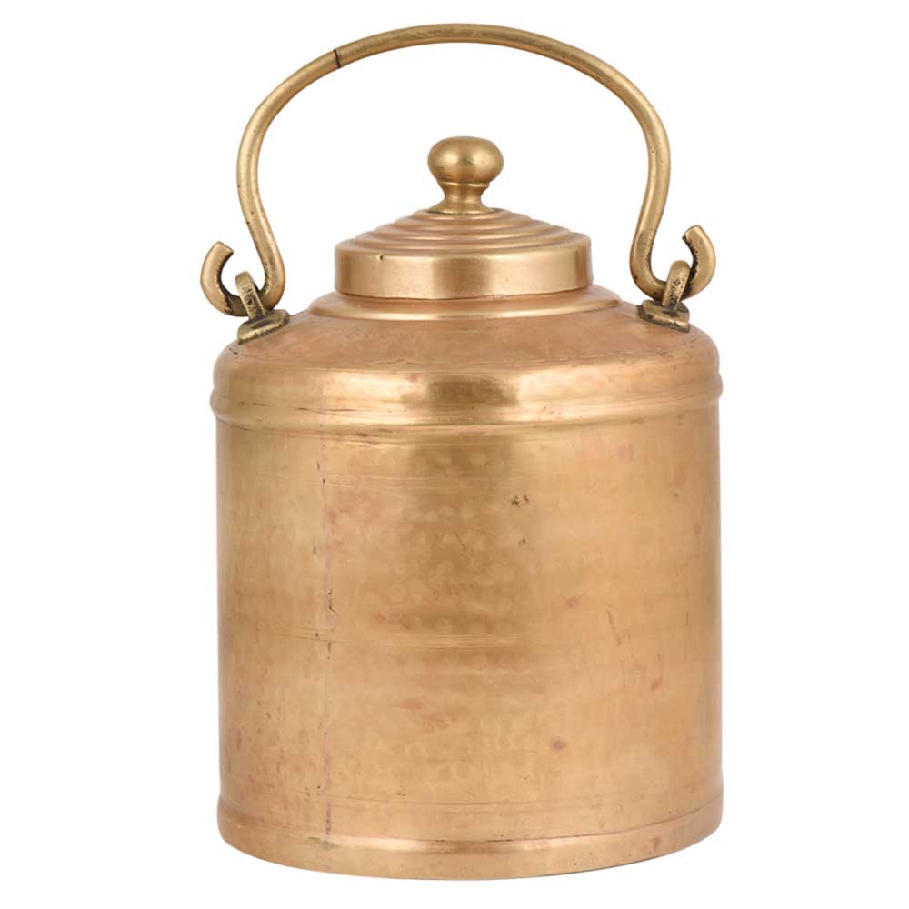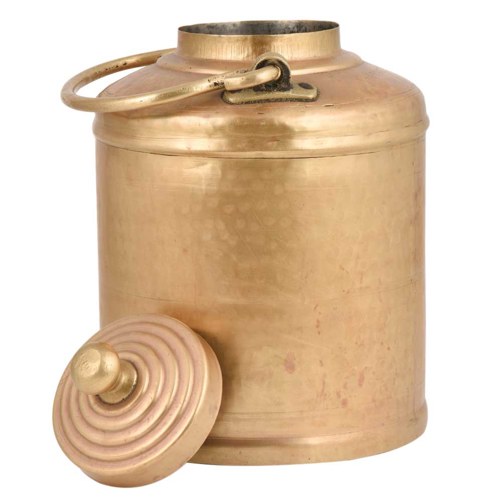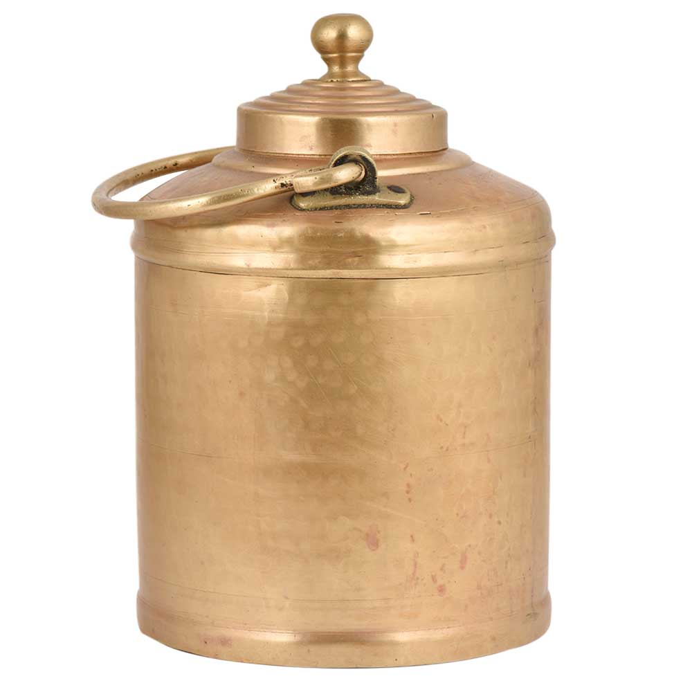 Golden Brass milk pot in a perfect cylindrical shape with small circular rings engraved on the lid and a lovely brass knob finial on the lid. Use it yourself or gift it to your near and dear ones . Diwali Gift, house warming gift or corporate gift. Use it as a showpiece or decoration for restaurants or shops.
