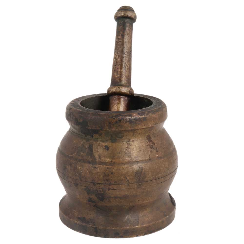Brass Mortar And Pestle Or Spice Herb Grinder is a solid brass tool accustomed to crush. Grind, and blend solid substances. The pestle may be a significant bat-shaped, generally twin terminated object, the top of that is employed for crushing and grinding. The mortar may be a bowl, usually fabricated from wood, ceramic, brass, or stone. The substance to be ground is placed within the mortar and ground, crushed or mixed with the pestle. This hand-loomed ancient mortar and pestle would look nice displayed in an exceedingly pharmacy or medical workplace or room.