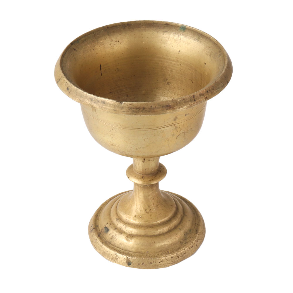 Here is a stunning hand-carved brass cup or wine goblet. Due to use and aging, the nickel polish on the goblet and mug has vanished, but you can still see the polishing that was done to stop the brass reaction. The brass goblet or mug is even more beautiful because of the exquisite carvings on it. The entire carving was done by hand. The goblet or brass mug is in excellent shape. The goblet or brass mug has no dents or other damage. When using this style of mug, the person holding it appears to be a king while sipping their beverage. These goblets and mugs are extremely hard to come by and make excellent gifts or additions to collections.