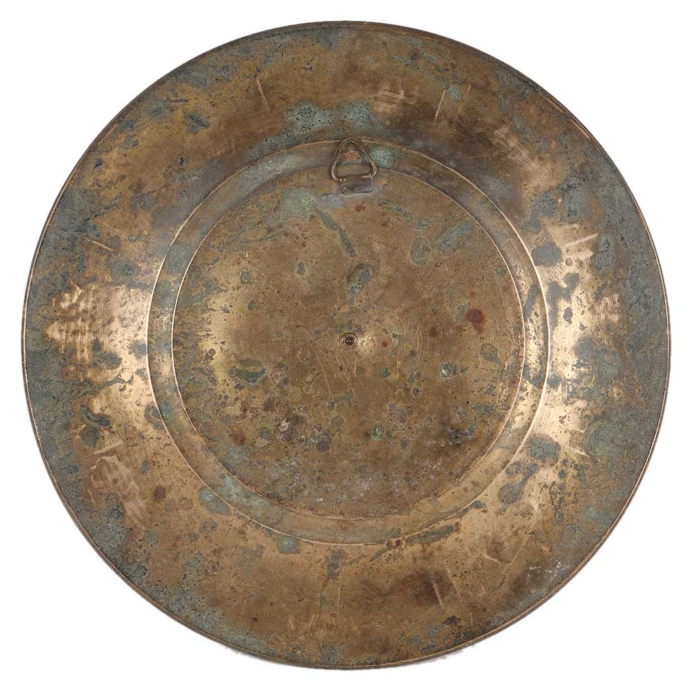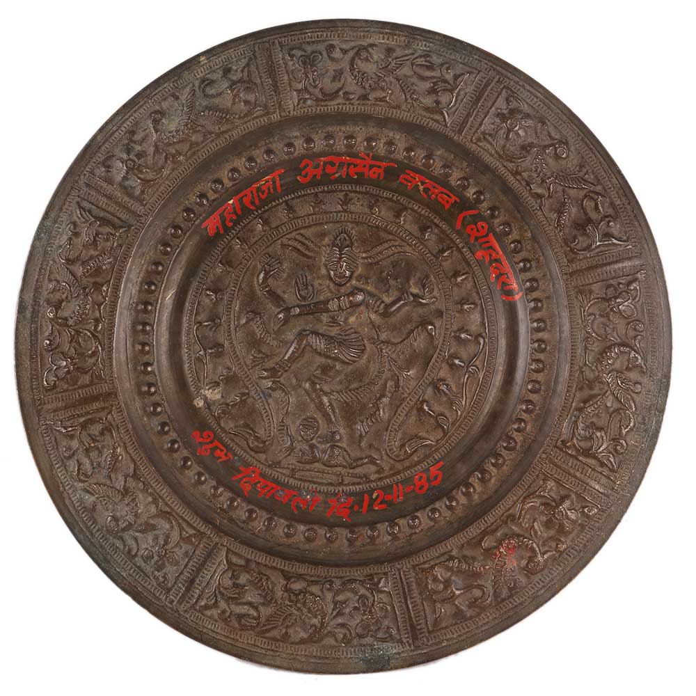 Brass plate with relief ornamentation depicting the four-armed Siva Nataraja as Lord of the Dance, standing with one leg on Aspama (also Apasmara Purusha), the miniature monster of ignorance, performing the cosmic dance (Tandava), which symbolises the process of formation. Shiva's right front hand is in Abhayamudra, and his right back hand is clutching an hourglass-shaped drum (damaru),Nataraja points to his left foot with his other left hand as a flames blazes from the outstretched palm of his left hand.