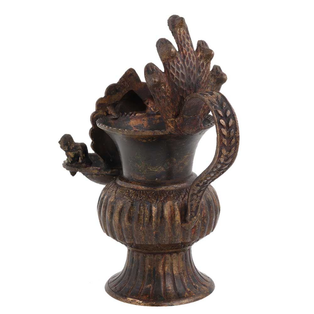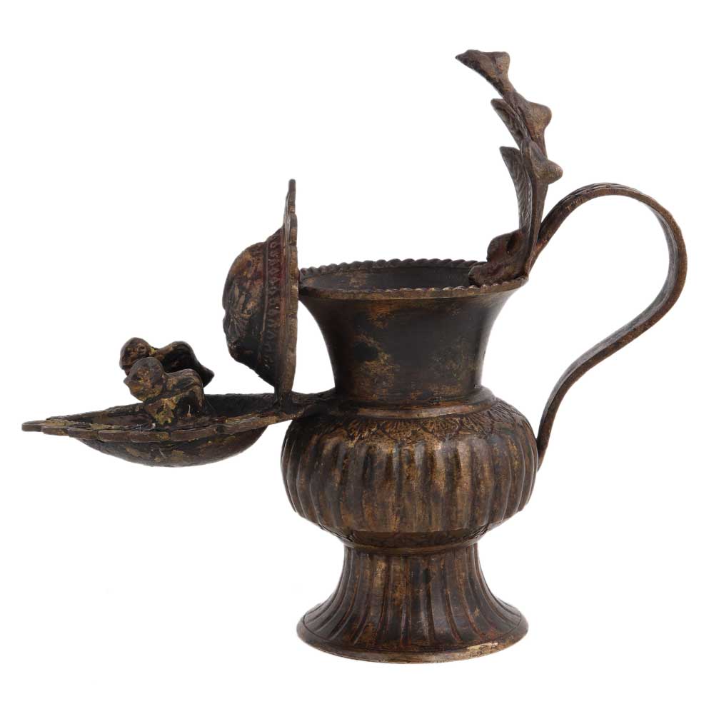 Old And used traditional brass lamp from Nepal with a lovely in pear shaped body in ribbed design and flared foot . It has a cobra head behind the ganesha image engraved on the lamp. Home decoration, hotel decoration, wedding decoration and gift, spiritual lamp, inaugural lamp, Diwali lamp . Gift for near and dear ones.