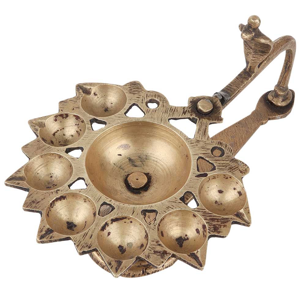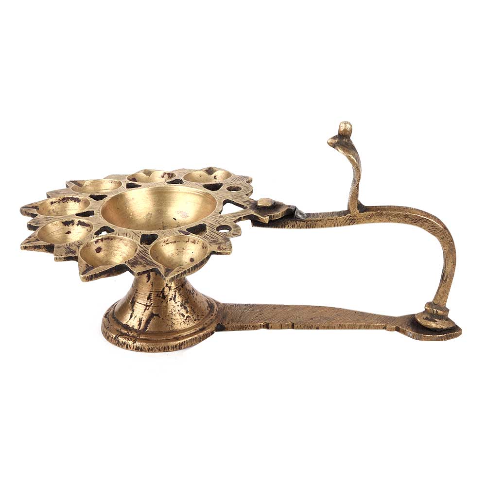 Handcrafted brass oil lamp made by the expert craftsmen of tribal India shows a oil lamp with eight wicks and snake head and a handle to hold the lamp. This lamp is often used in religious places and in the puja room or worship room . Ideal gift for relatives and friends.