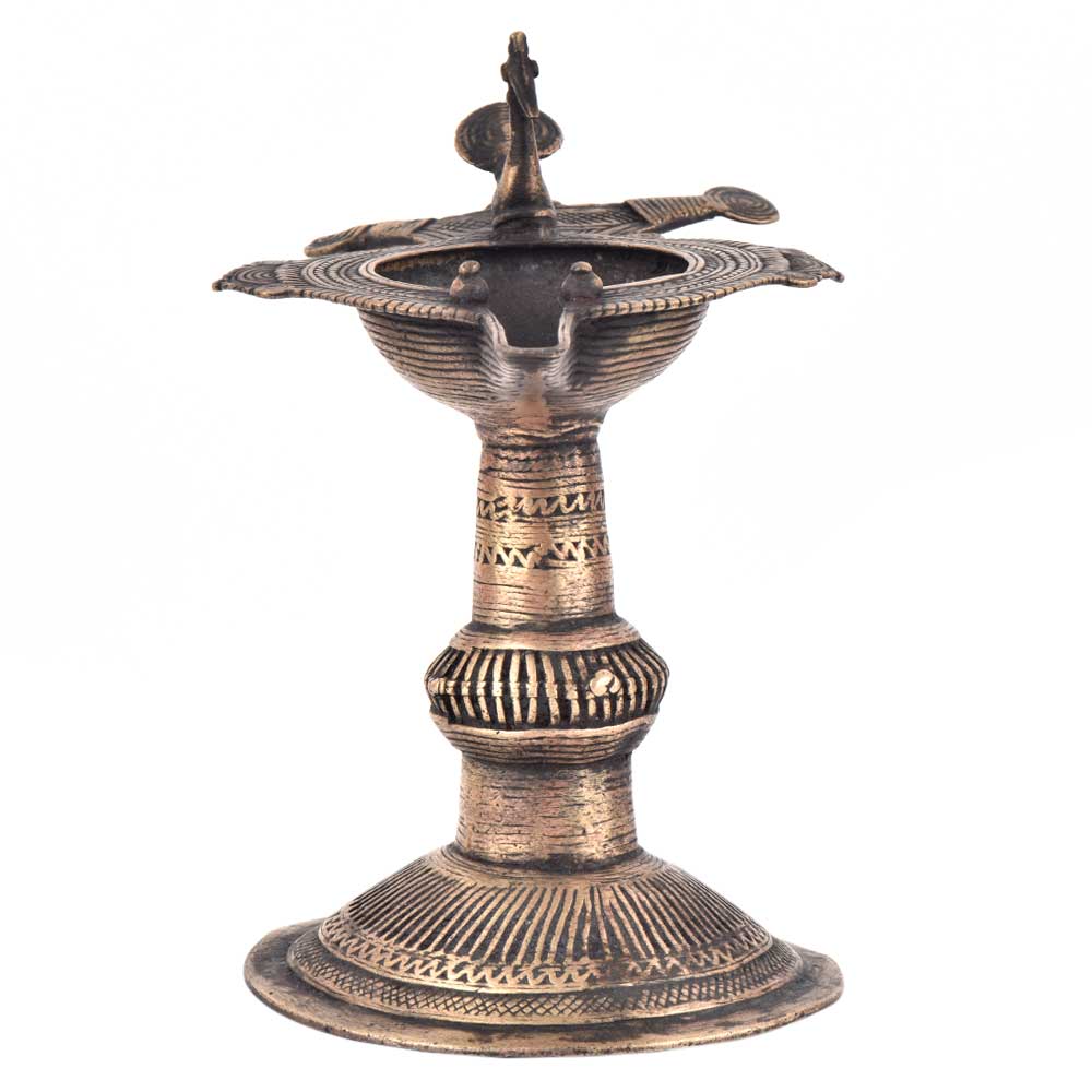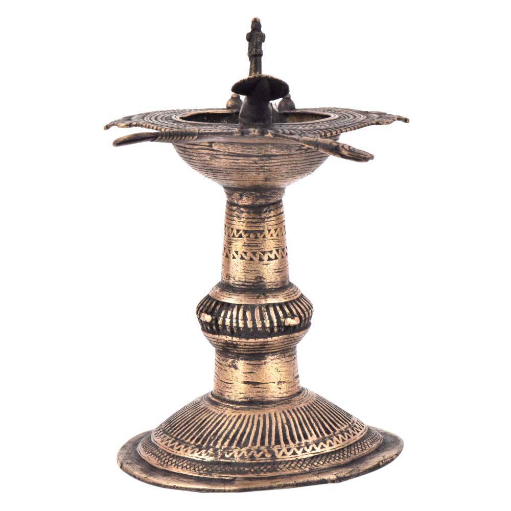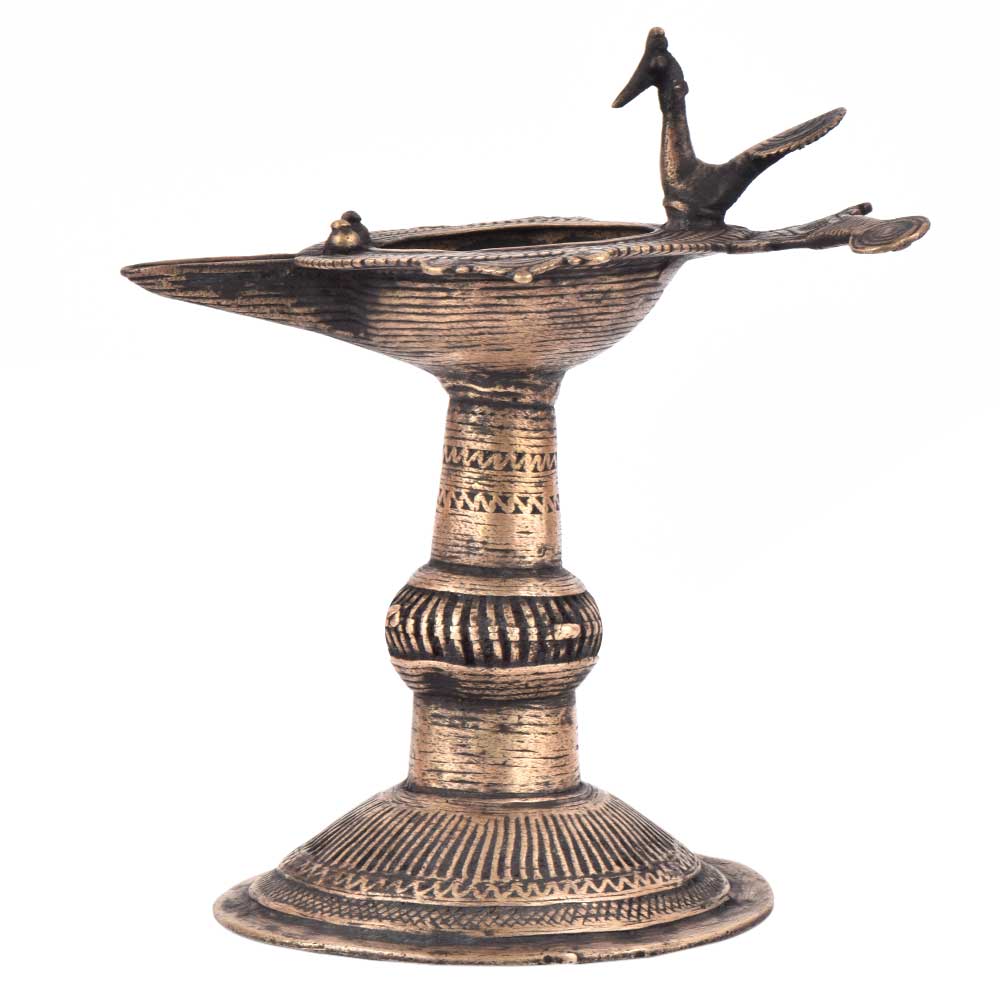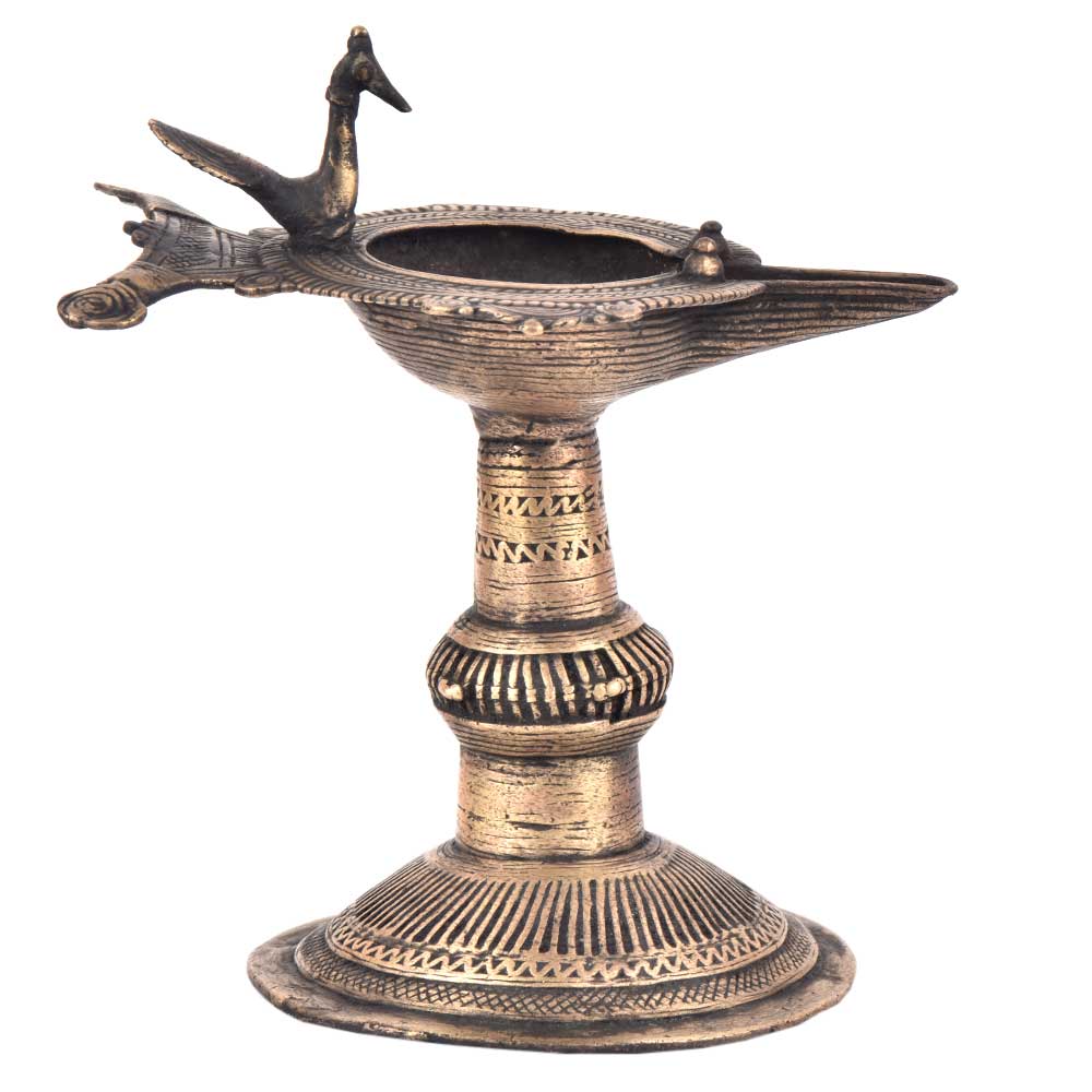 Handcrafted using old lost wax technique primarily practiced in Orrisa and West Bengals by the local or tribal artisans. In this technique the molten wax is poured into desired clay mould and when the wax melts the clay is broken and we get the desired metal object which is further polished to perfection. The Deep Cup Can Be Filled with Oil and Light a Cotton Wick. Diyas/ Oil Lamps are Considered Auspicious as in Hindu Religion. It is detailed with Elephant and Peacock Animals with Beautiful Details.