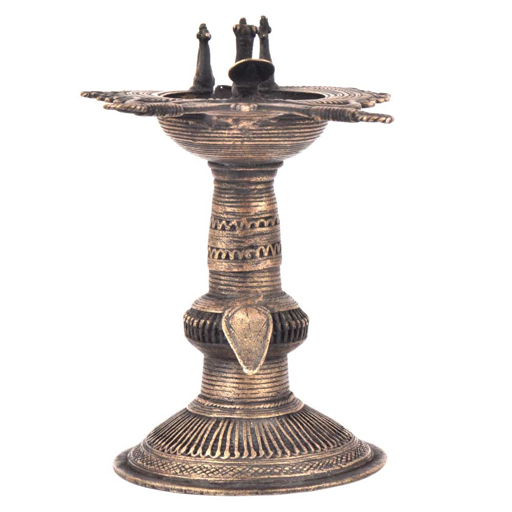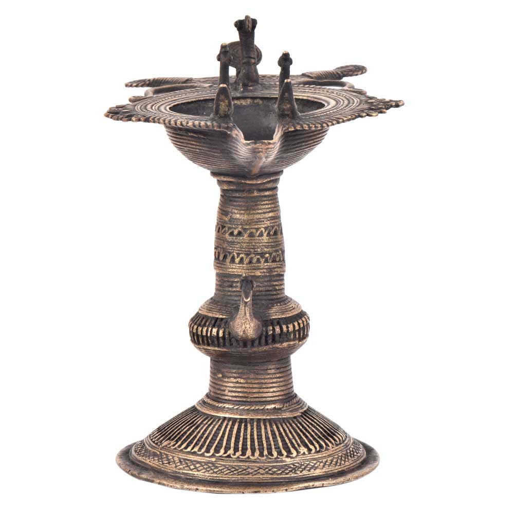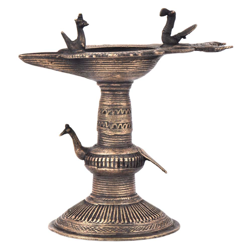 Handcrafted using old lost wax technique primarily practiced in Orrisa and West Bengals by the local or tribal artisans. In this technique the molten wax is poured into desired clay mould and when the wax melts the clay is broken and we get the desired metal object which is further polished to perfection. The Deep Cup Can Be Filled with Oil and Light a Cotton Wick. Diyas/ Oil Lamps are Considered Auspicious as in Hindu Religion. It is detailed with Elephant and Peacock Animals with Beautiful Details.