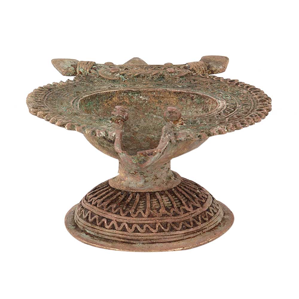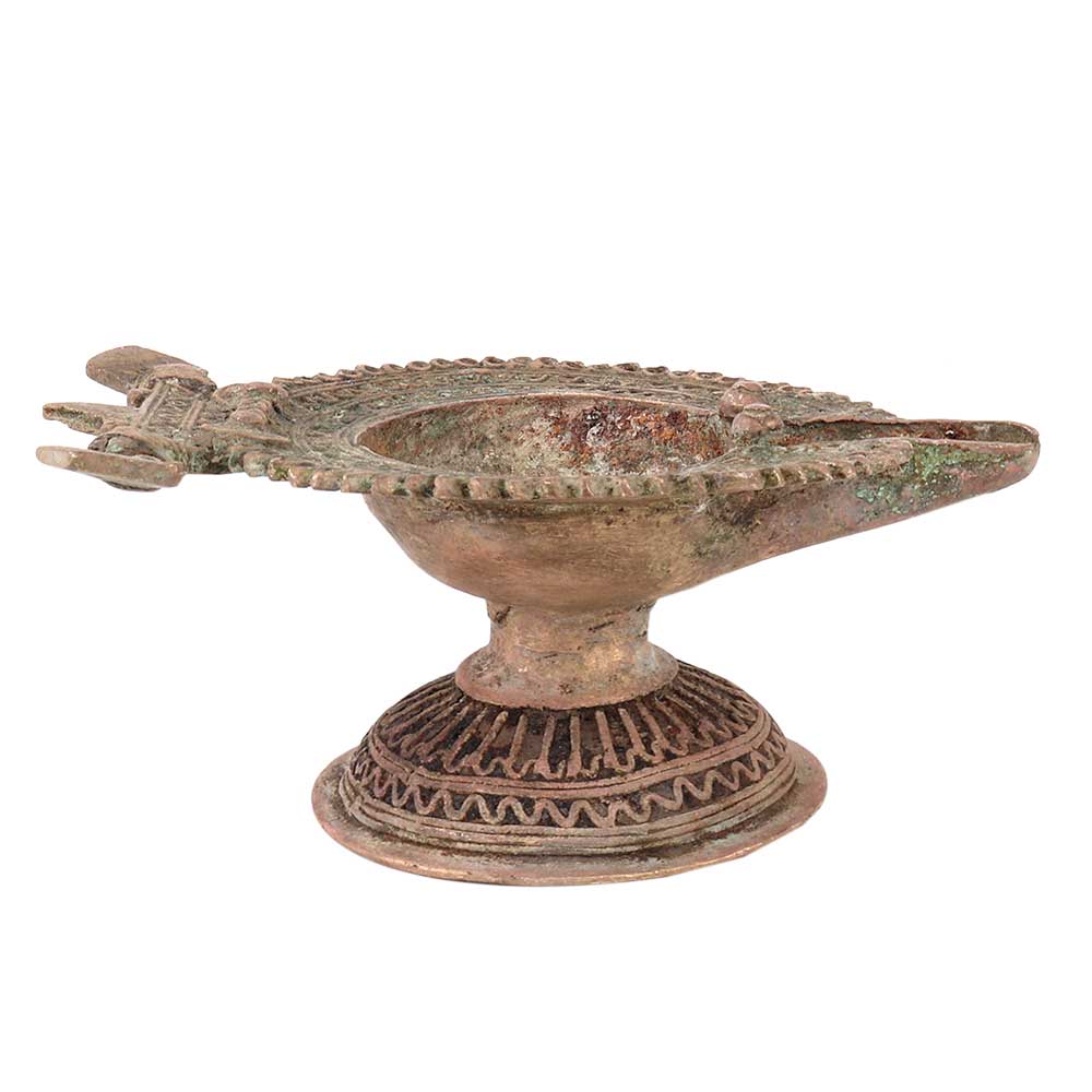 Handcrafted using old lost wax technique primarily practiced in Orrisa and West Bengals by the local or tribal artisans. In this technique the molten wax is poured into desired clay mould and when the wax melts the clay is broken and we get the desired metal object which is further polished to perfection. The Deep Cup Can Be Filled with Oil and Light a Cotton Wick. Diyas/ Oil Lamps are Considered Auspicious as in Hindu Religion. It is detailed with Elephant and Peacock Animals with Beautiful Details.