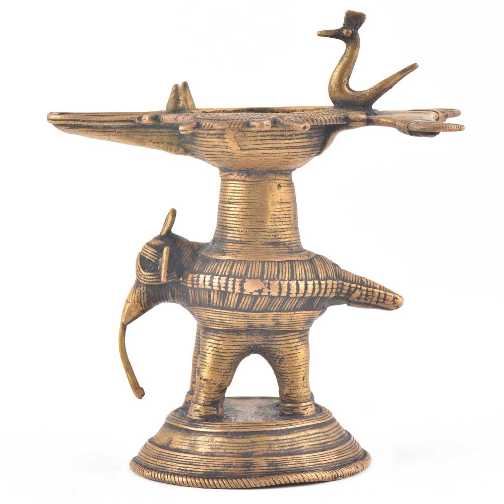 This is a very rare looking brass oil lamp which has a deep cup to fill the oil with a stand that has an elephant statue . The best feature is that it also has a beautiful peacock bird on top. This lamp is often lit on auspicious occcasions like diwali and also used as a gift for friends and relatives.