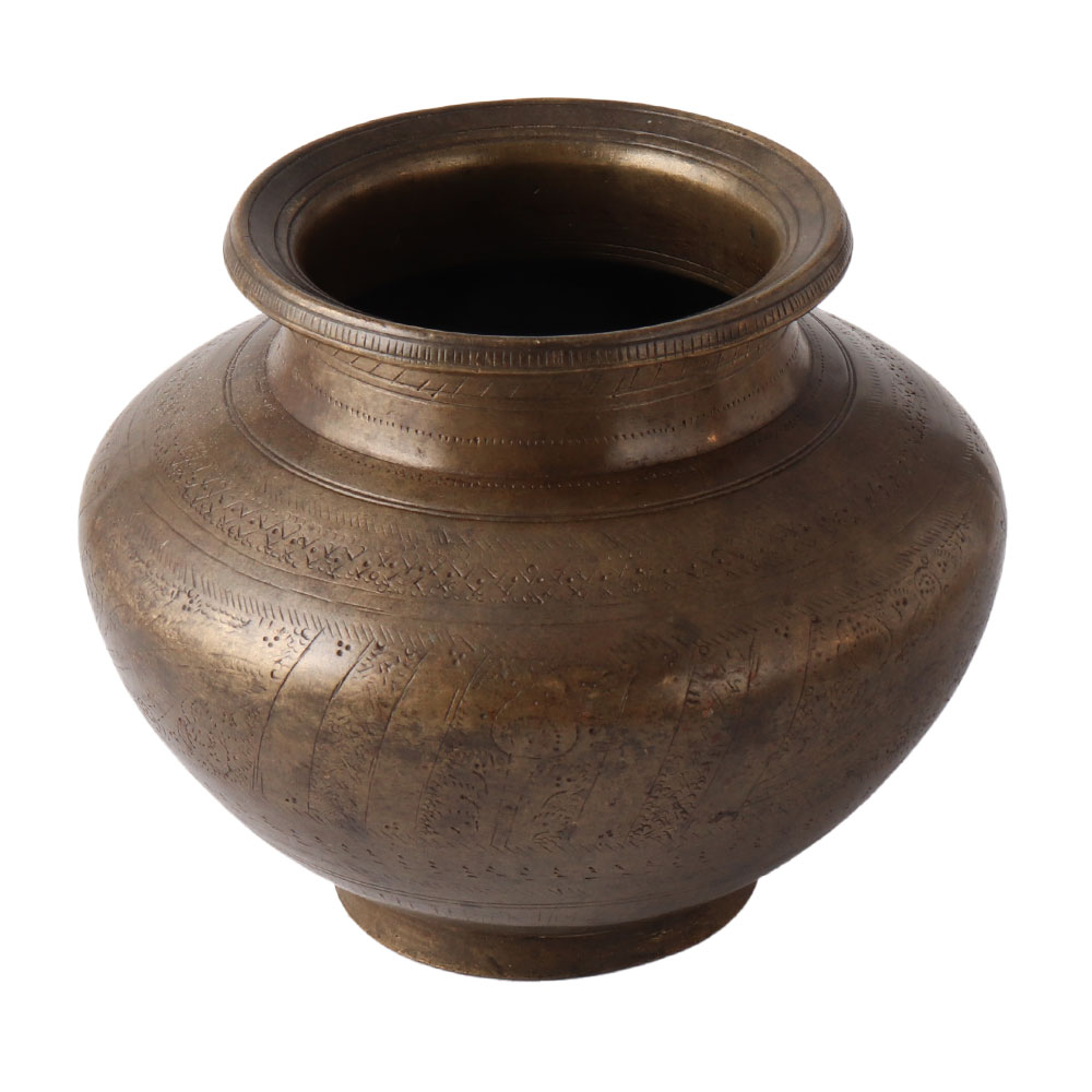 An old brass lota transports the wearer to a time of regal customs, exquisite cultures, and a rich way of life. When combined with other artifacts, this lota in its classic lota form becomes a charming antique possession. This brass water jar has a simple aesthetic, a lovely rustic appeal, and a distinctive form and size. It is utilised for performing rituals during any fortunate occasion. This brass pot is a suitable addition to your antique collection because it was used to store water in ancient times.