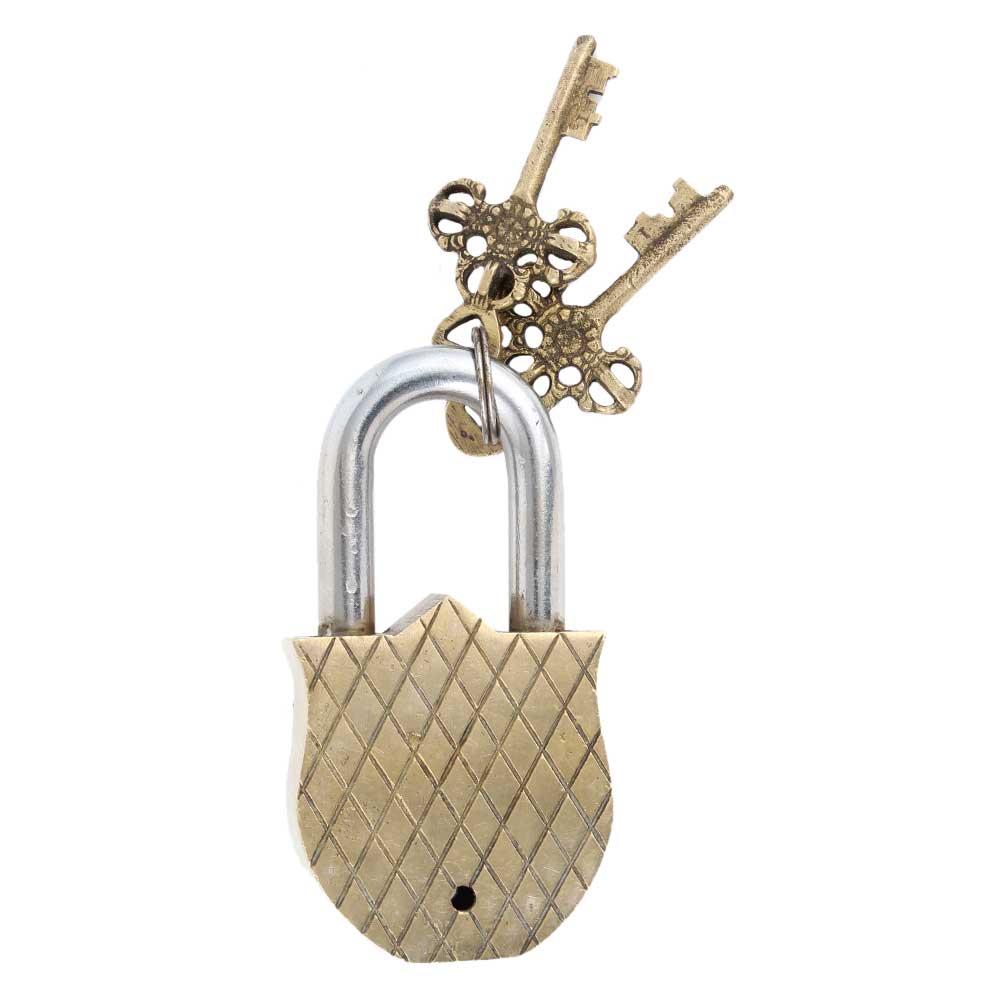 Brass Padlock Solider Face Design With 2 Decorative Keys .The lock looks study with 2 decorative keys. Enhance the decor value of the house, office, hotel, etc. Great for gifting during weddings, anniversaries etc.
