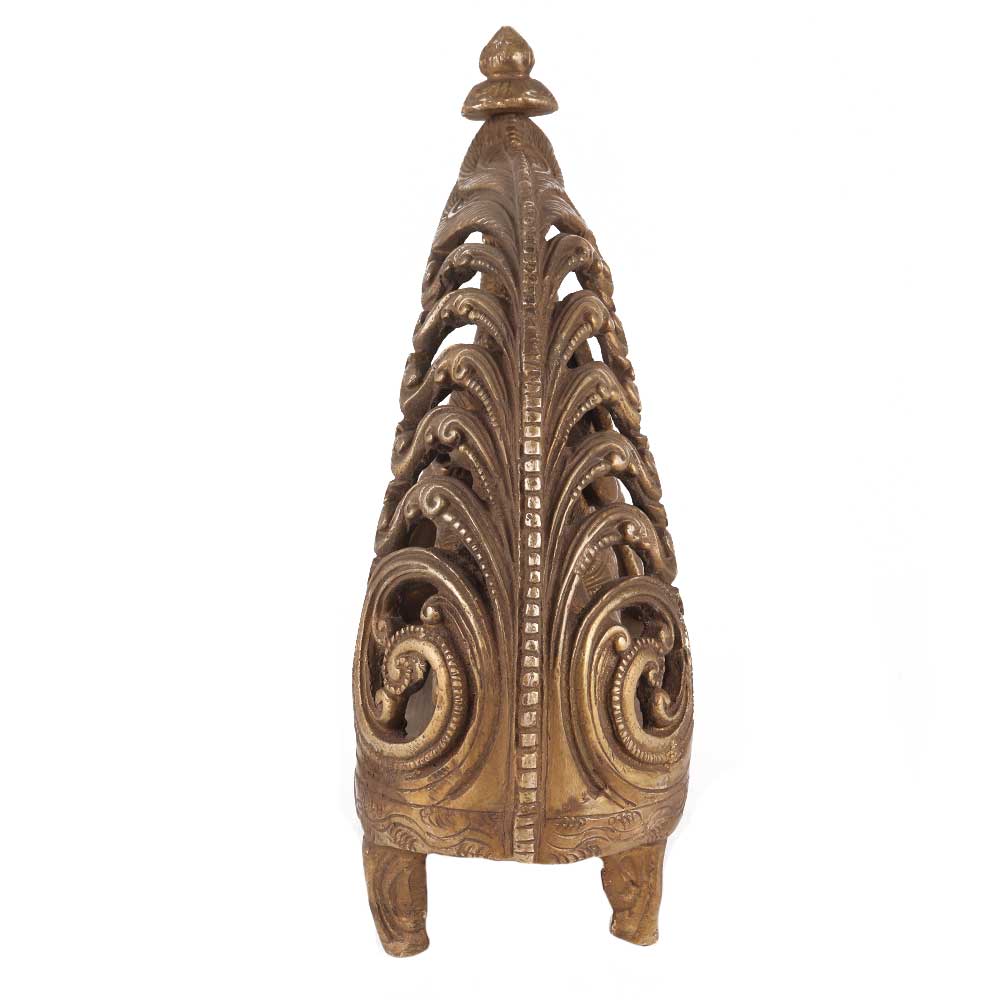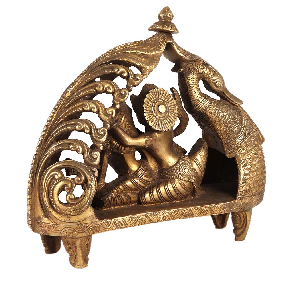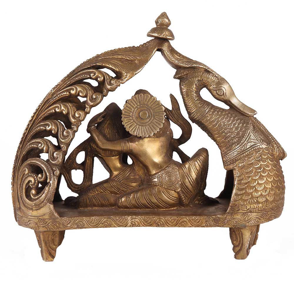 Krishna and Radha are sitting under the shelter of a peacock-shaped boat's tail. Krishna caresses Radha's chin with his hand, while Radha grips Krishna's arm. The pose conveys the obvious affection the two have for one another.