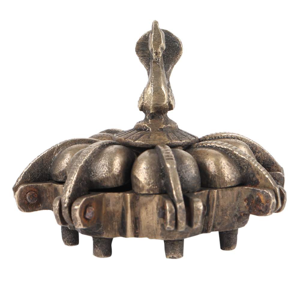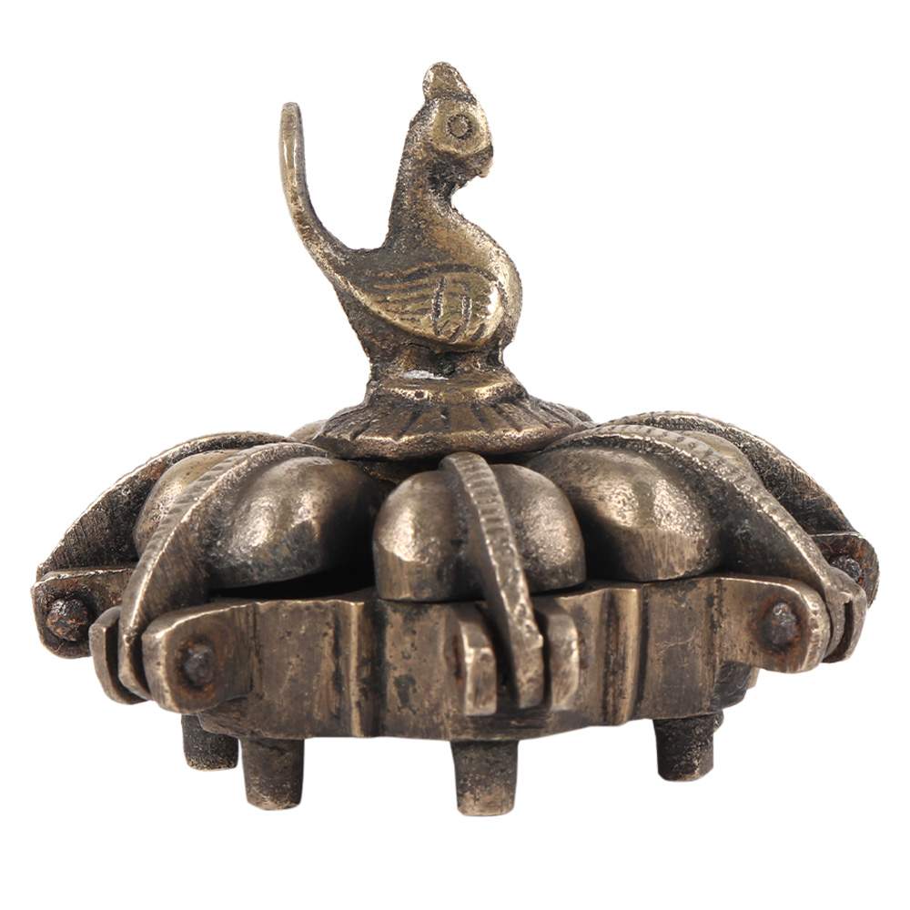 This lovely multi-compartment brass kumkum or sindoor vermilion box will complement your pooja decorations. This item, with elaborate features and many slots, can let you attend to your puja demands. This badam-shaped piece also makes an excellent gift. This elegant kumkum or sindoor vermilion box is made of durable brass for long-lasting use. This one-of-a-kind accent item adds a touch of refinement to your decor.
