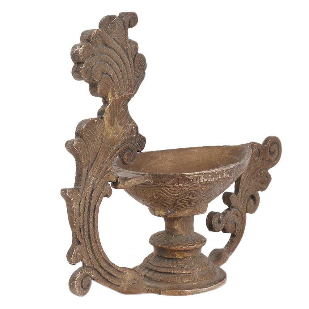 Brass Peacock Diya Pooja Decoration .Ideal and Perfect for Home, Temple and House Warming gifting as well. Hand graven Pure Brass Diya with Antique end Brass kerosene lamp with one wick holder and exquisite style graven elaborately with fine details.. The brass kerosene lamp includes a pedestal like support that keeps the diya on top of from the bottom