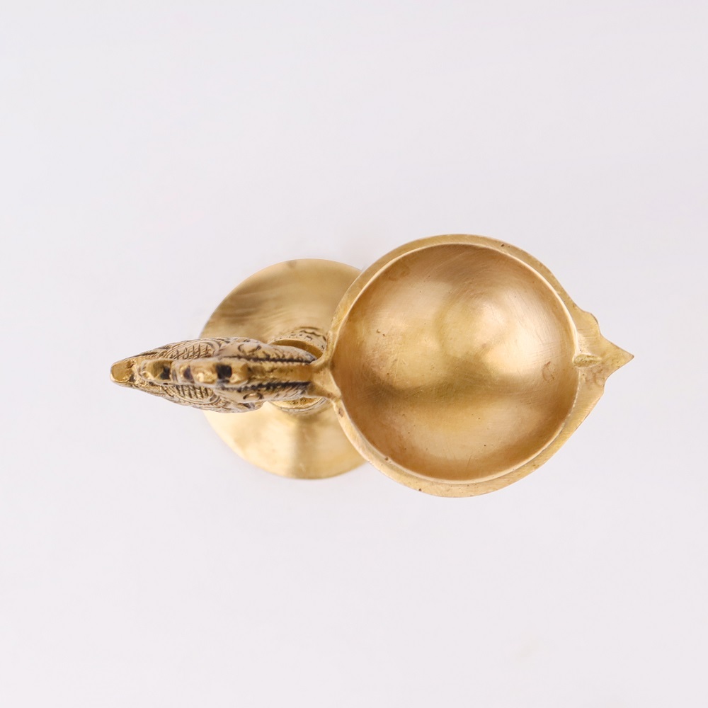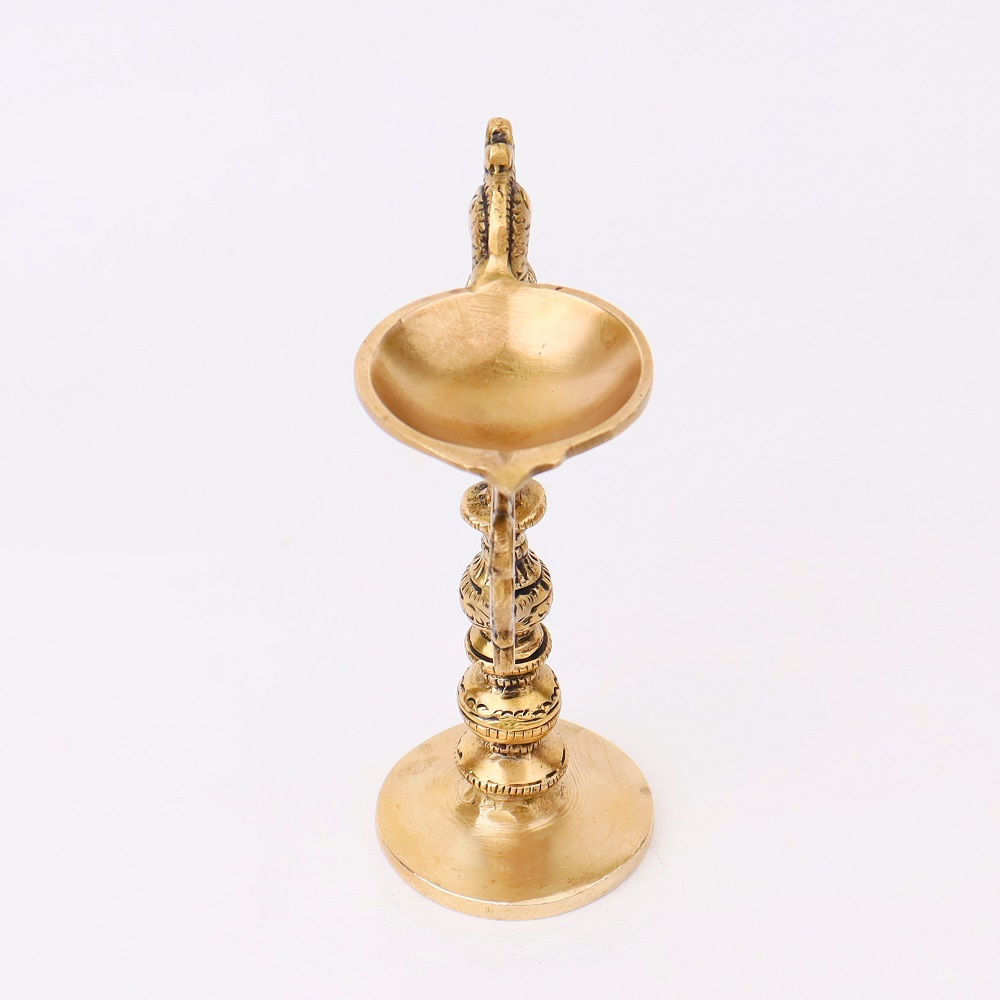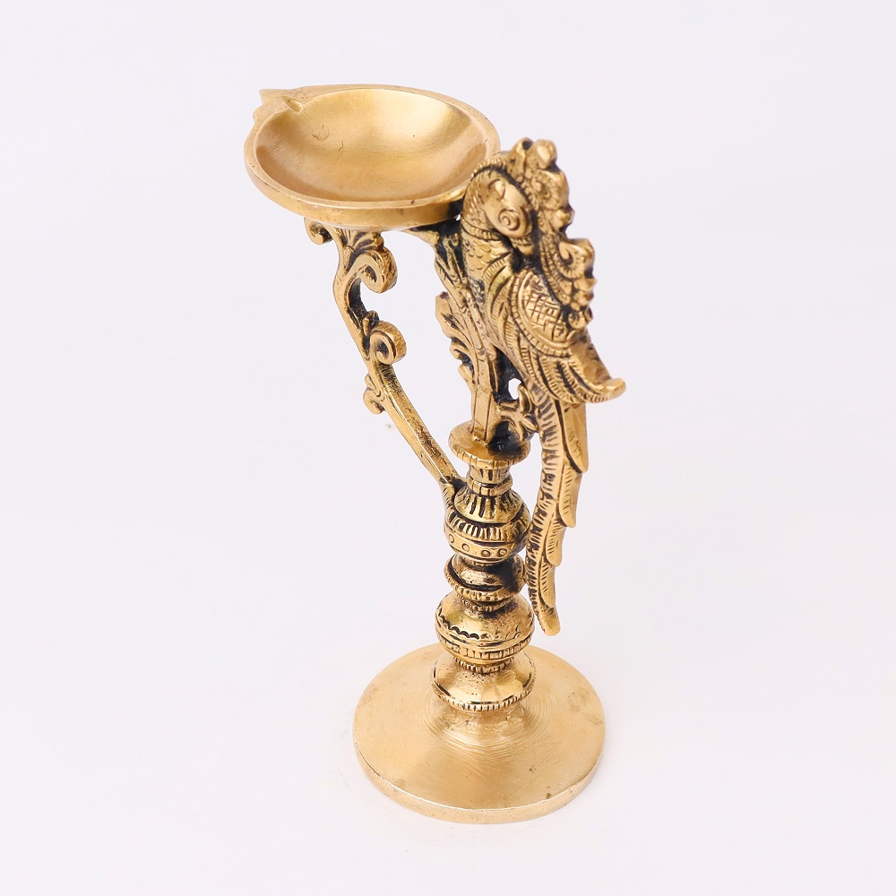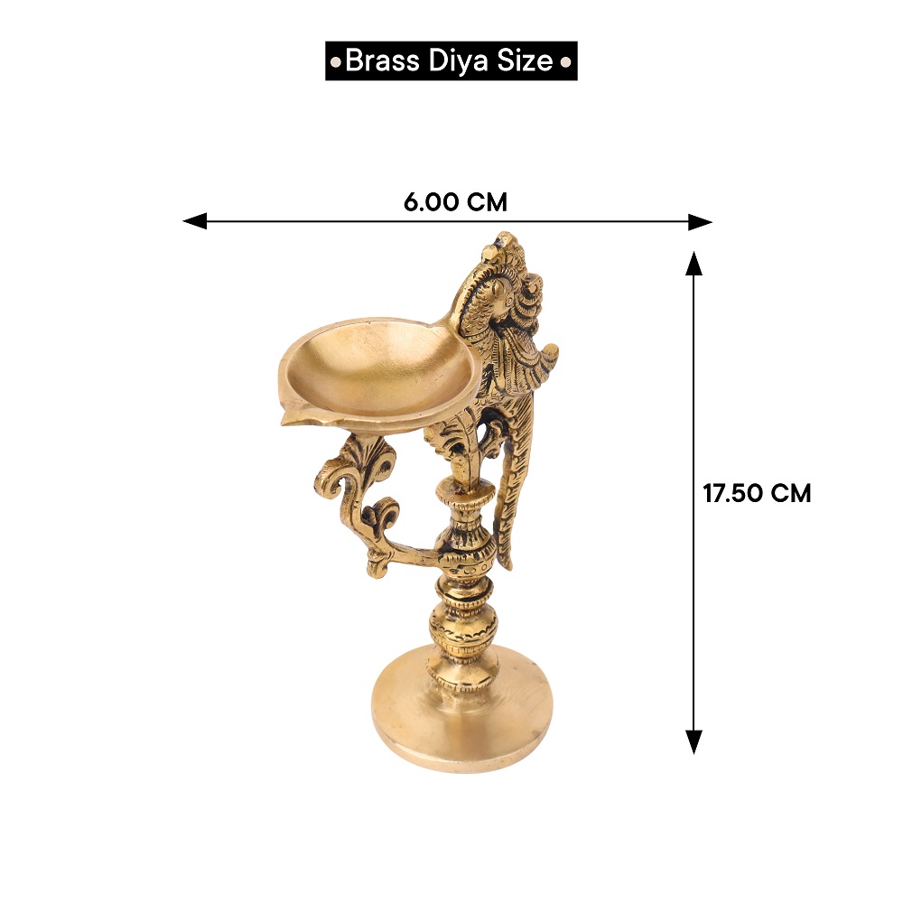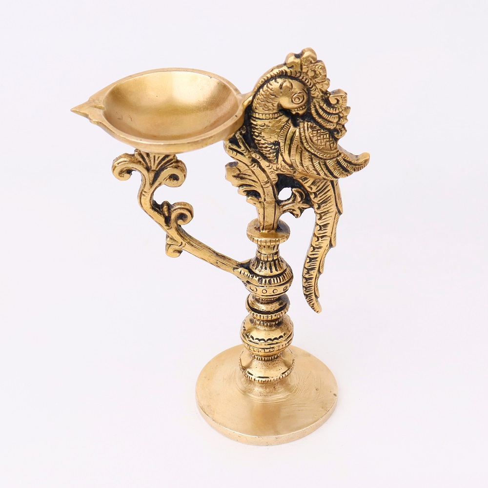 Peacock brass handle Diya is a one-of-a-kind work of art handcrafted with a traditional touch and intricate designs. This brass Diya features a hollow base, a vertical stand with simple and elegant carvings, and a handle to hold over a Peacock design. This brass Diya features an adorable Peacock carved with lovely designs and a single wick diya with a broad base with more oil holding capacity. This brass Diya will be the best home decor that adorns and adds beauty wherever it is kept. This brass diya can be used as decoration on any festive or special occasion.
