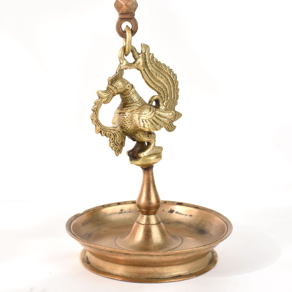 Brass Made of high-quality brass, diya hanging. Peacock and diya plate created a beautiful design for it. Oil lamps are used with a diya plate. Since ancient times, this brass hanging has been used to adorn homes and temples. It can be used for pooja and festivals.