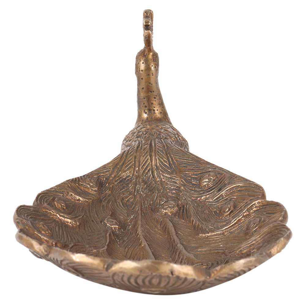 Brass Peacock feathers cascade into a fluffy fan to capture all of your treasures. This one-of-a-kind tray combines 70's glitz with current materials used to create a timeless addition to your foyer, bedside table, or washroom countertop. It comes with an antique golden finish.