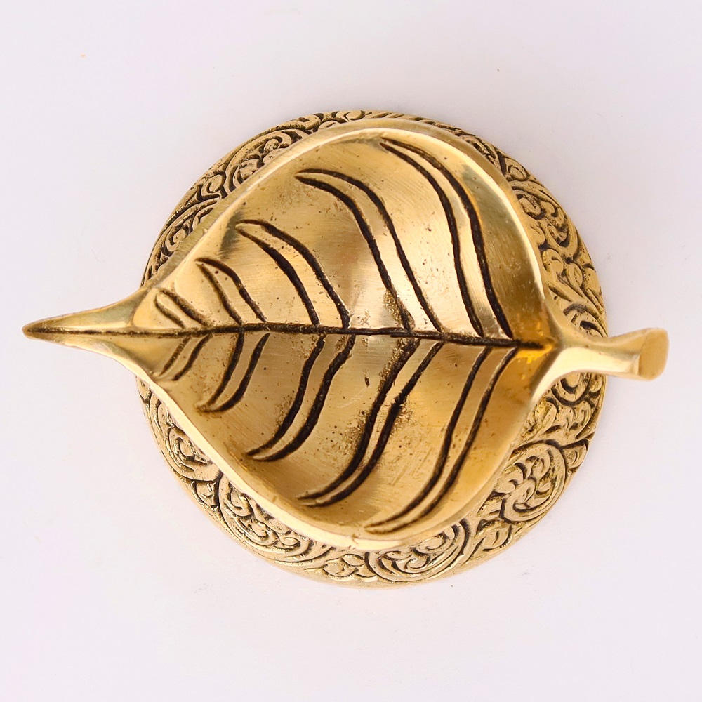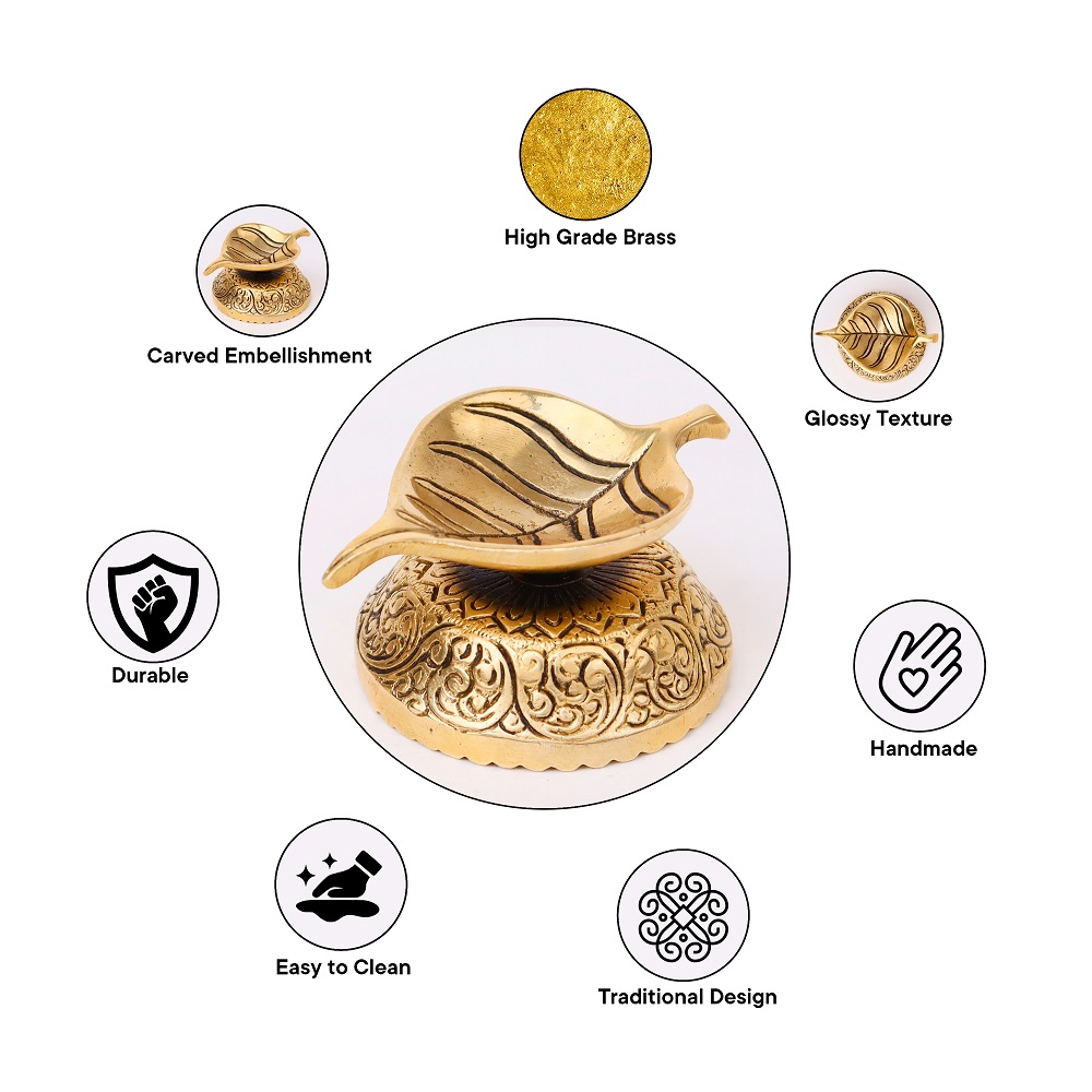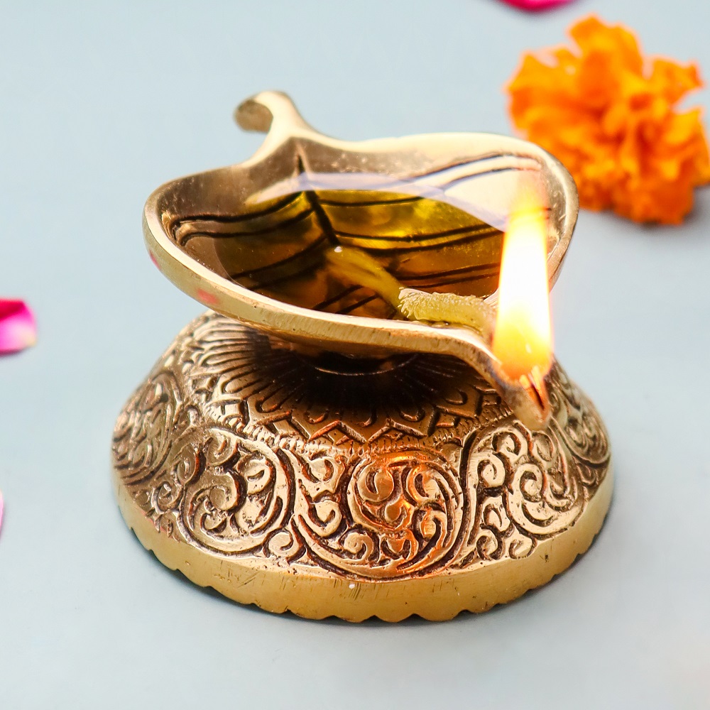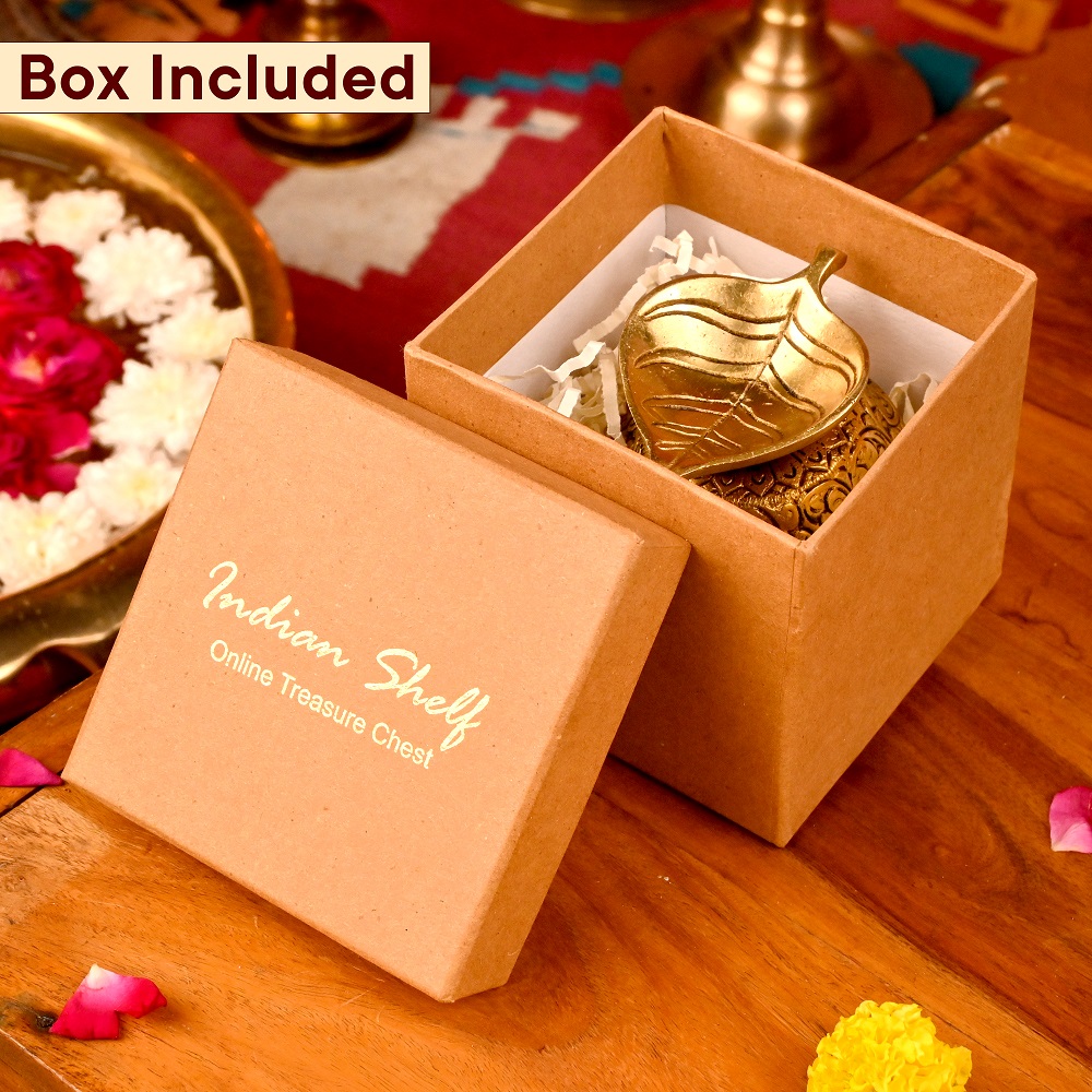 Illuminate your rituals with the Brass Peepal Leaf Oil Lamp Diya on Decorative Base, a piece that blends tradition, artistry, and symbolism. Shaped like the revered peepal leaf, this diya symbolizes enlightenment, wisdom, and divine blessings. Crafted from solid brass with a golden polish, it rests on a decorative base that adds elegance and stability, making it ideal for mandir décor, Diwali celebrations, and auspicious gifting.