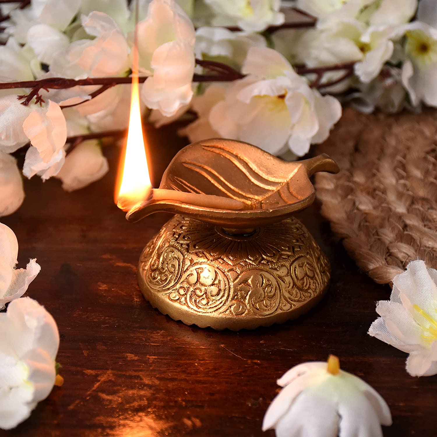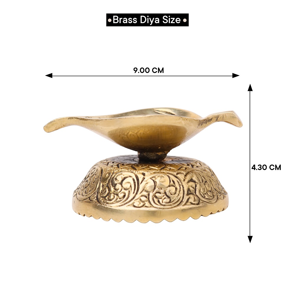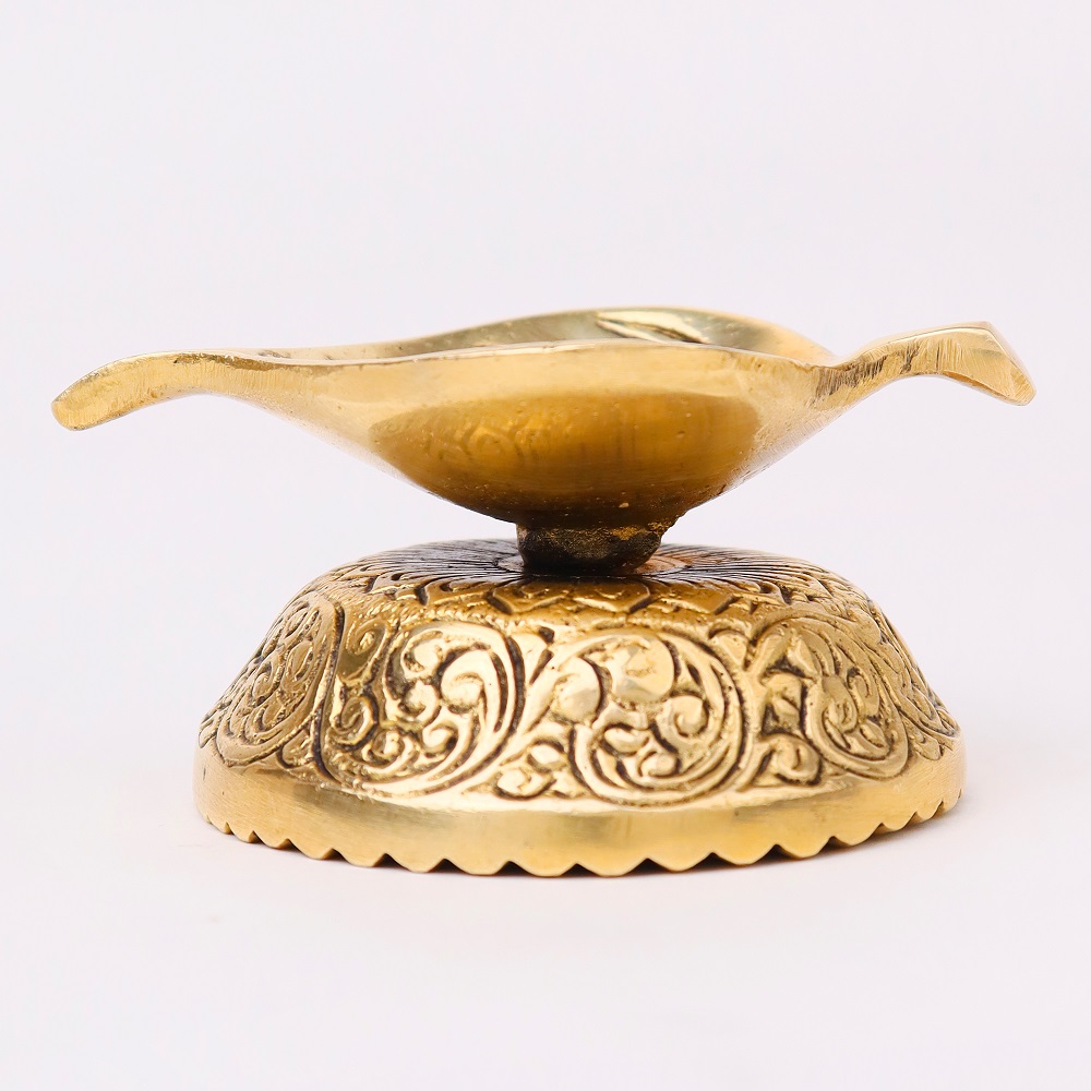 Illuminate your rituals with the Brass Peepal Leaf Oil Lamp Diya on Decorative Base, a piece that blends tradition, artistry, and symbolism. Shaped like the revered peepal leaf, this diya symbolizes enlightenment, wisdom, and divine blessings. Crafted from solid brass with a golden polish, it rests on a decorative base that adds elegance and stability, making it ideal for mandir décor, Diwali celebrations, and auspicious gifting.