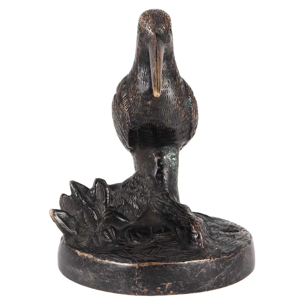 A vintage brass sculpture of a bird gently placed on something like a log. The legs, feathers, eyes, and tree trunk of the figurine are all detailed. This figurine has wear from aging, but it gives charm to the piece. It make an excellent accent to any old brass home decor.
