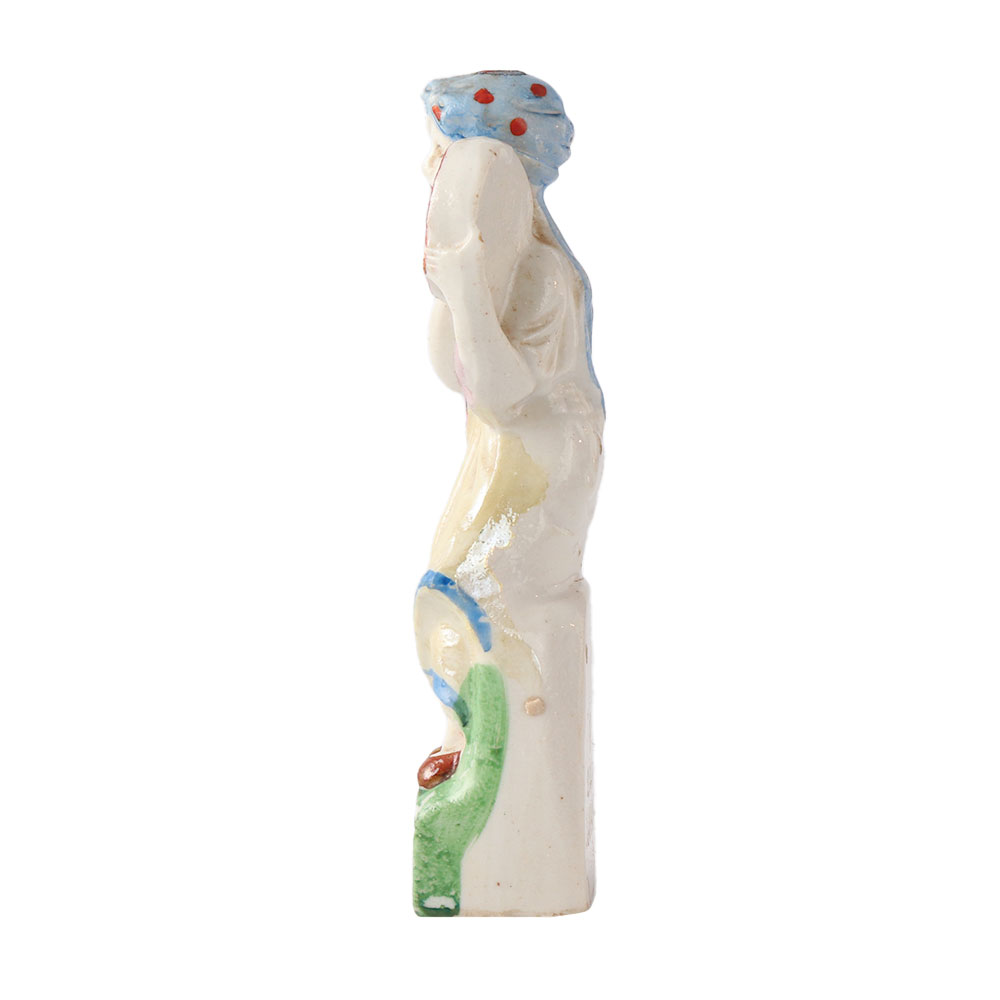 Hand painted porcelain figurine of a woman holding a dhapli, a type of kind of instrument. The woman is wearing business attire, and her hair is wrapped in a pretty scarf. These kinds of figurines are frequently given as gifts to friends and family and used as a conversation starter and a piece of attention.