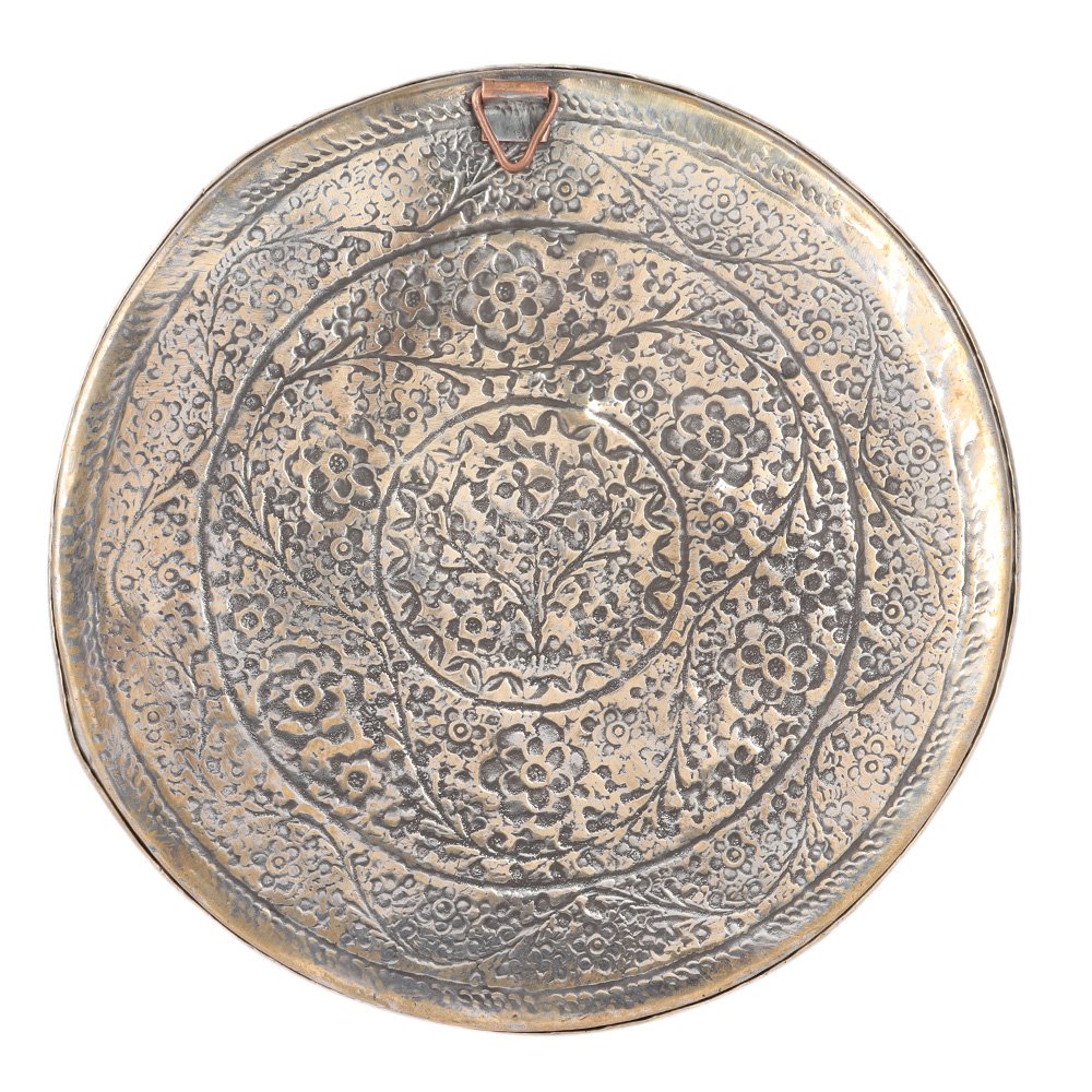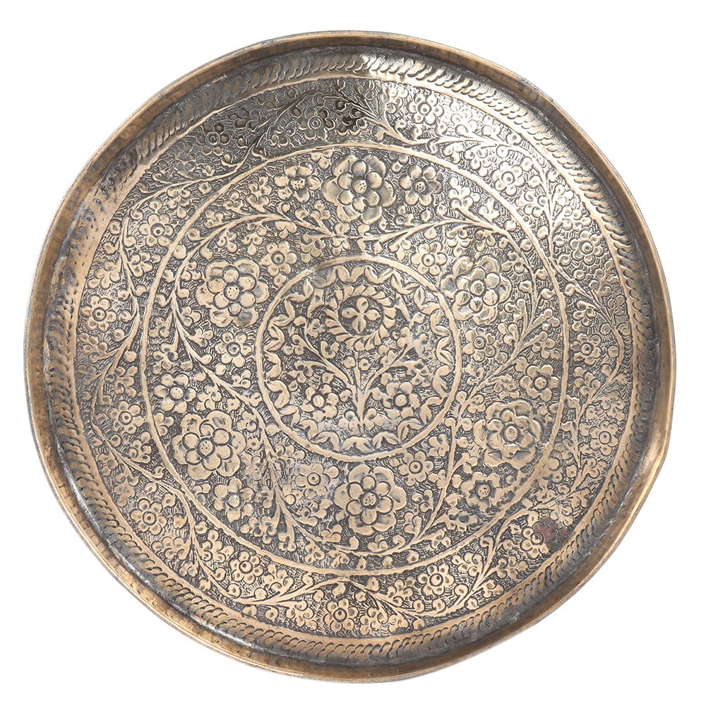 Handcrafted antique style brass plate exemplifies excellent craftsmanship with an old charming appearance and an embossed flower pattern that will complement your home décor. This brass plate or wall hanging is ideal for presenting on special occasions and during the holiday season.