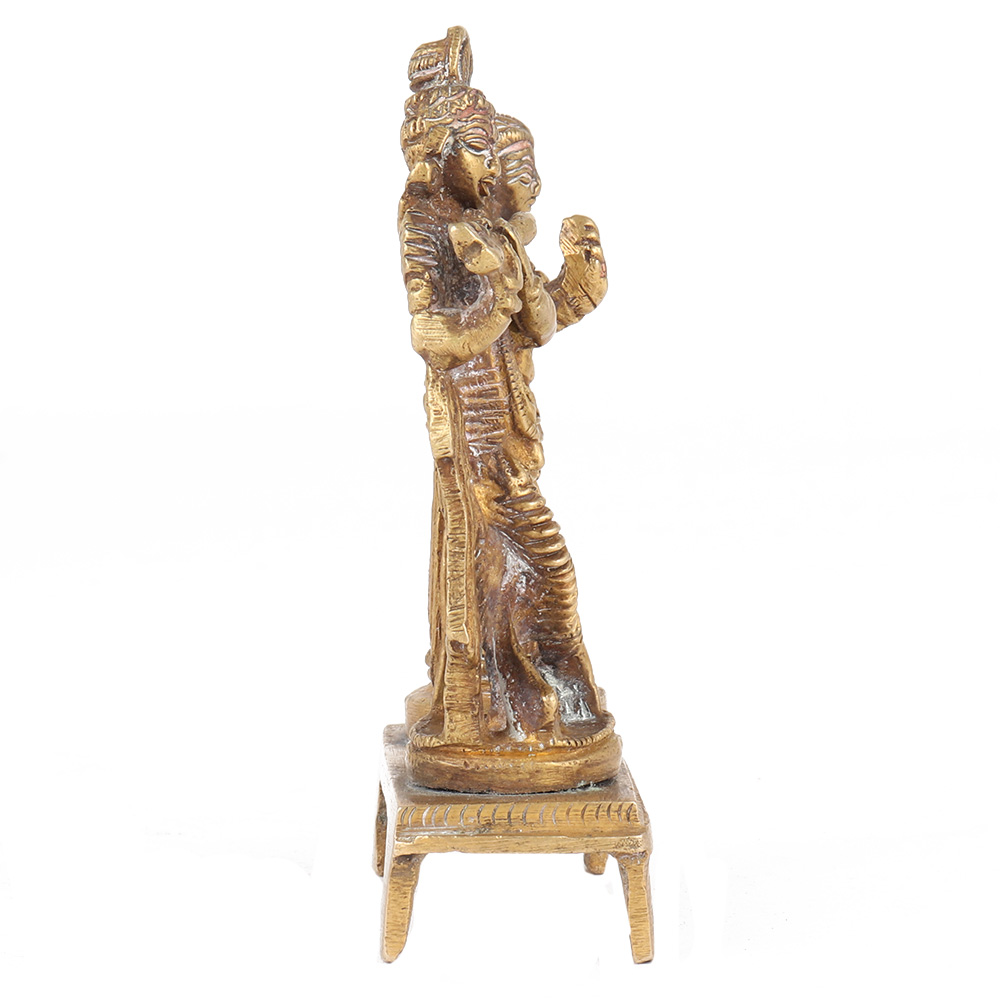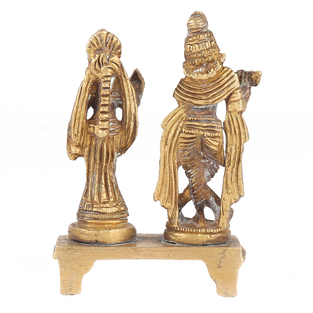 The brass statue of Sri Radha Krishna is exquisitely handcrafted of Brass metal with an antique finish. It is accompanied by Radha Rani playing his Flute with two of his hands in Tri Vanki Pose (3 Bends) with a graceful grin on their holy faces. is ideal for home puja mandir , work place decor and a lovable gift for occasions at home, temple during religious festivals, Sri Krishna ejyanthi, Janmashtami, marriage and Ayosh Homam.