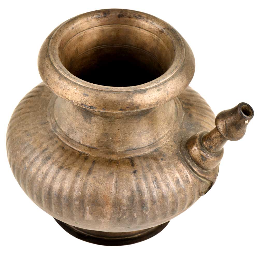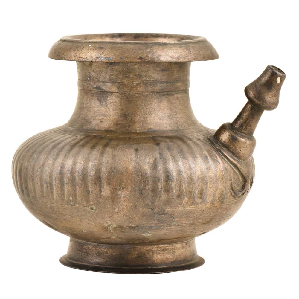 This handmade south Indian style water pot has a ribbed design and a spout meant to pour water is made by the expert crafts men of India. The pot has a bulging belly that tapers to the neck and opens up to a rim and a spout .It comes with a lovely patina.