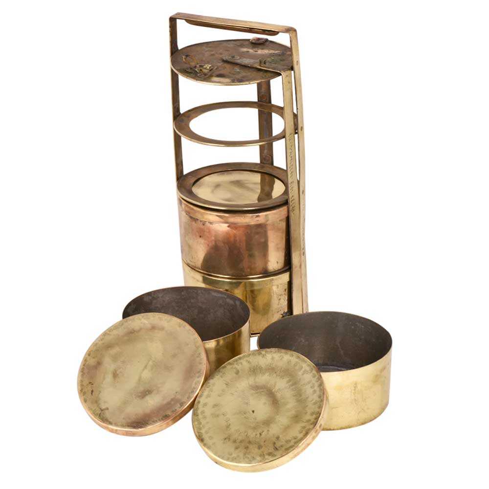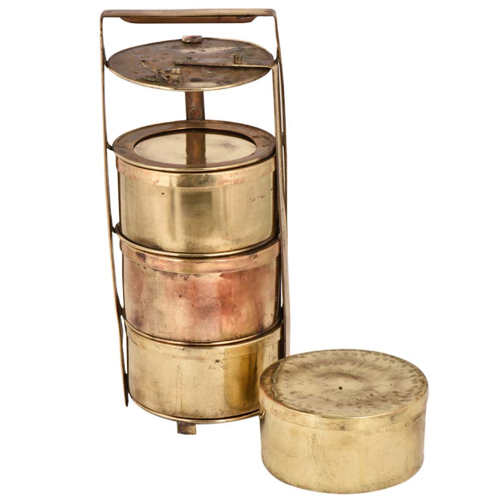 Functional brass Tiffin box with four containers place in a ring frame and a latch on the top container. Each container has its individual lid and is sealed with the help of a thick frame that keeps all the containers intact. Gift it to your near ones on diwali, Christmas, new year or house warming. Use it as a showpiece or a table decoration kitchenware.