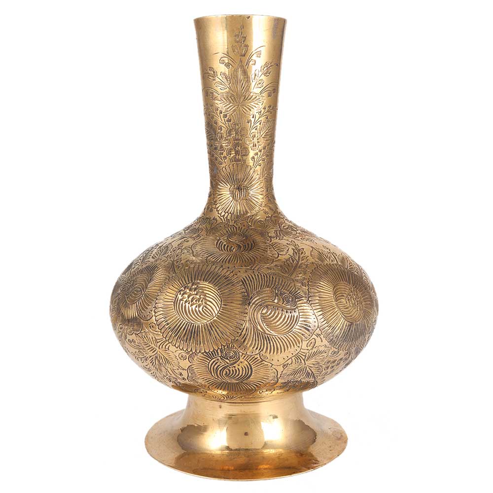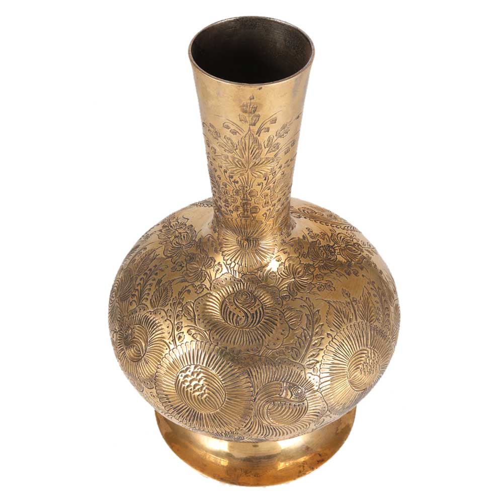 This is a wonderful old brass vase with floral carvings from Asia. It's ideal for tabletop decoration. This vintage brass flower vase is shaped like a surahi bottle and is ideal for displaying some few stems of fresh or dried roses. This brass vase adds warmth and character to a bookshelf arrangement if not used. A great addition to any brass assortment.
