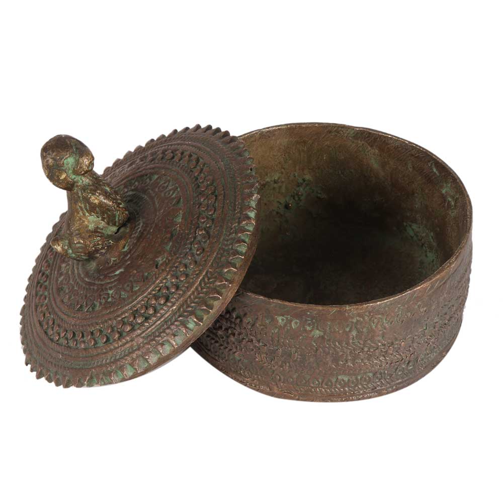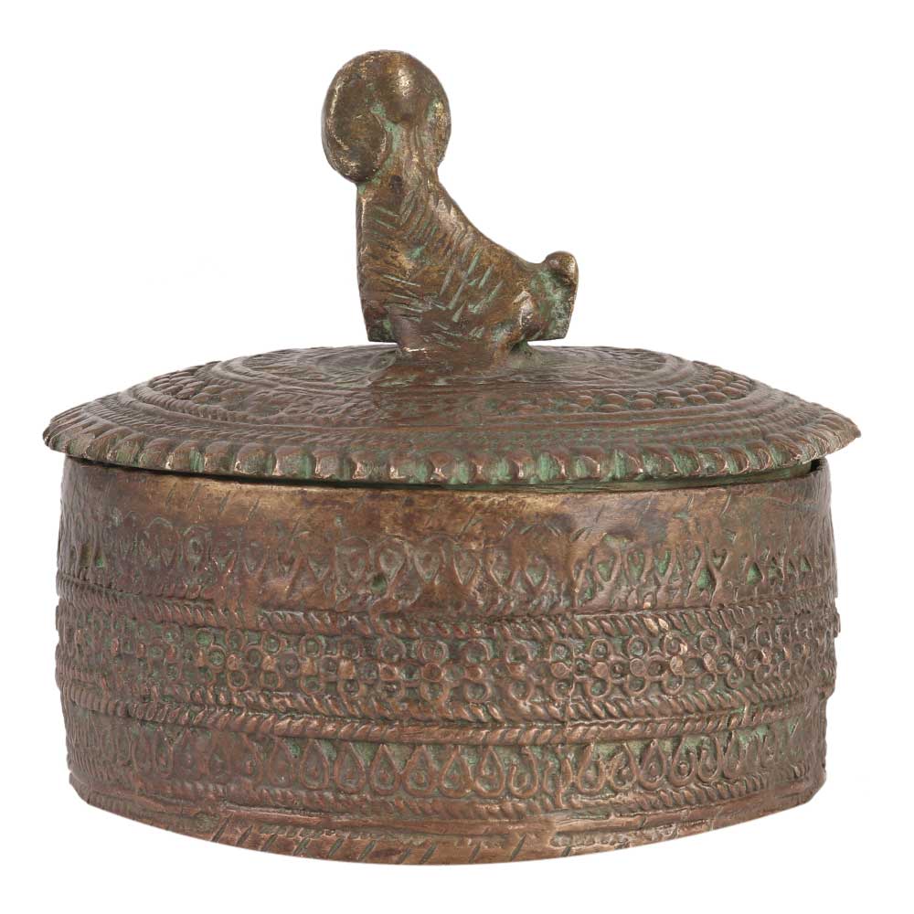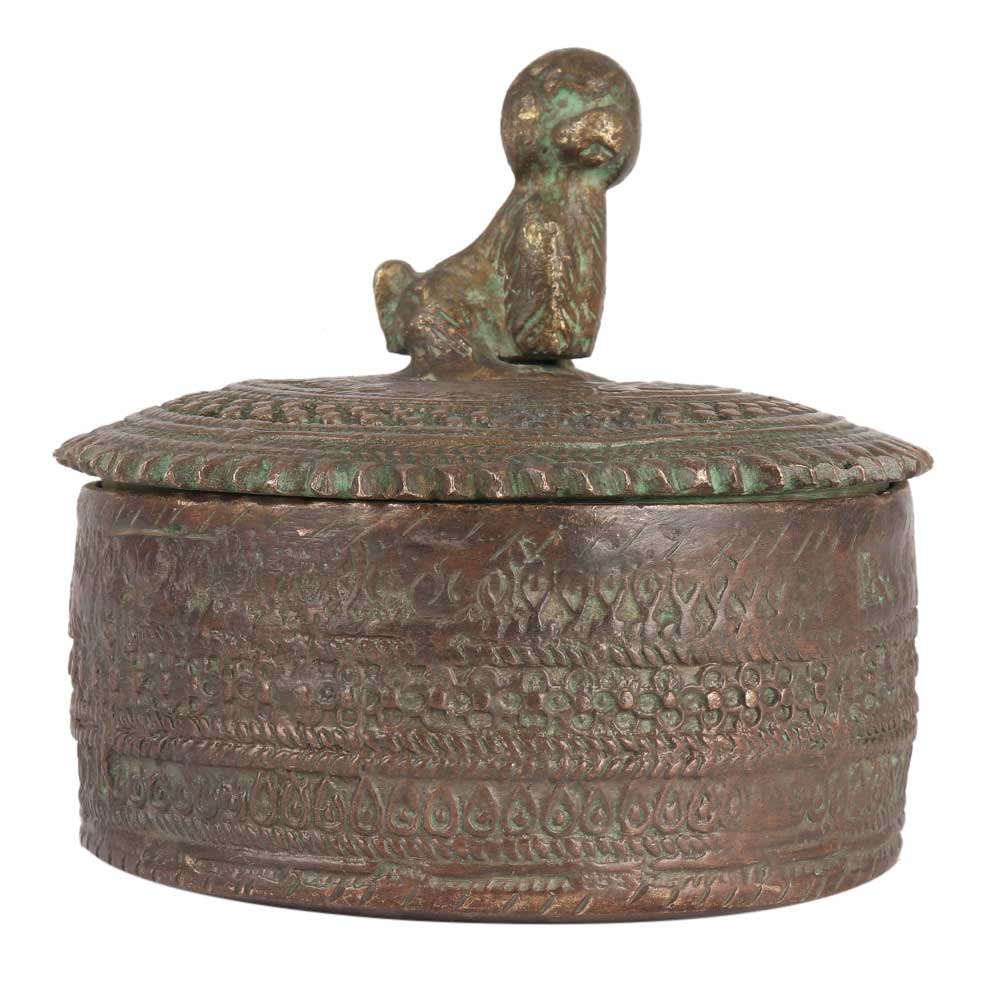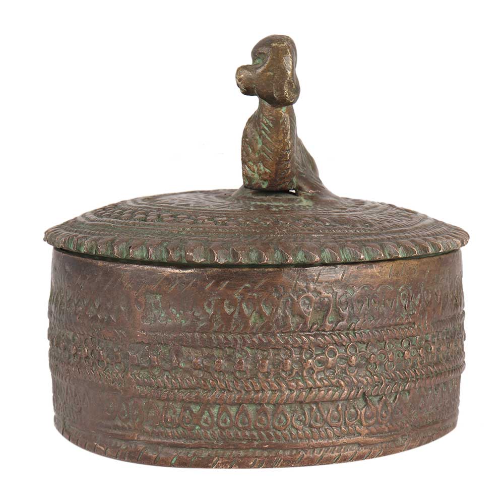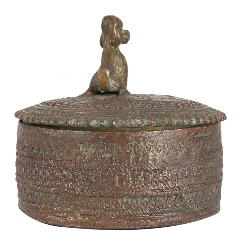 Rust - proof brass box with a lid and a dog figurine on top in antique finish. The dog is screwed onto the lid from beneath and is quite heavy for its size. The lid fits snugly onto the round box. A lovely present for housewarmings and other occasions.