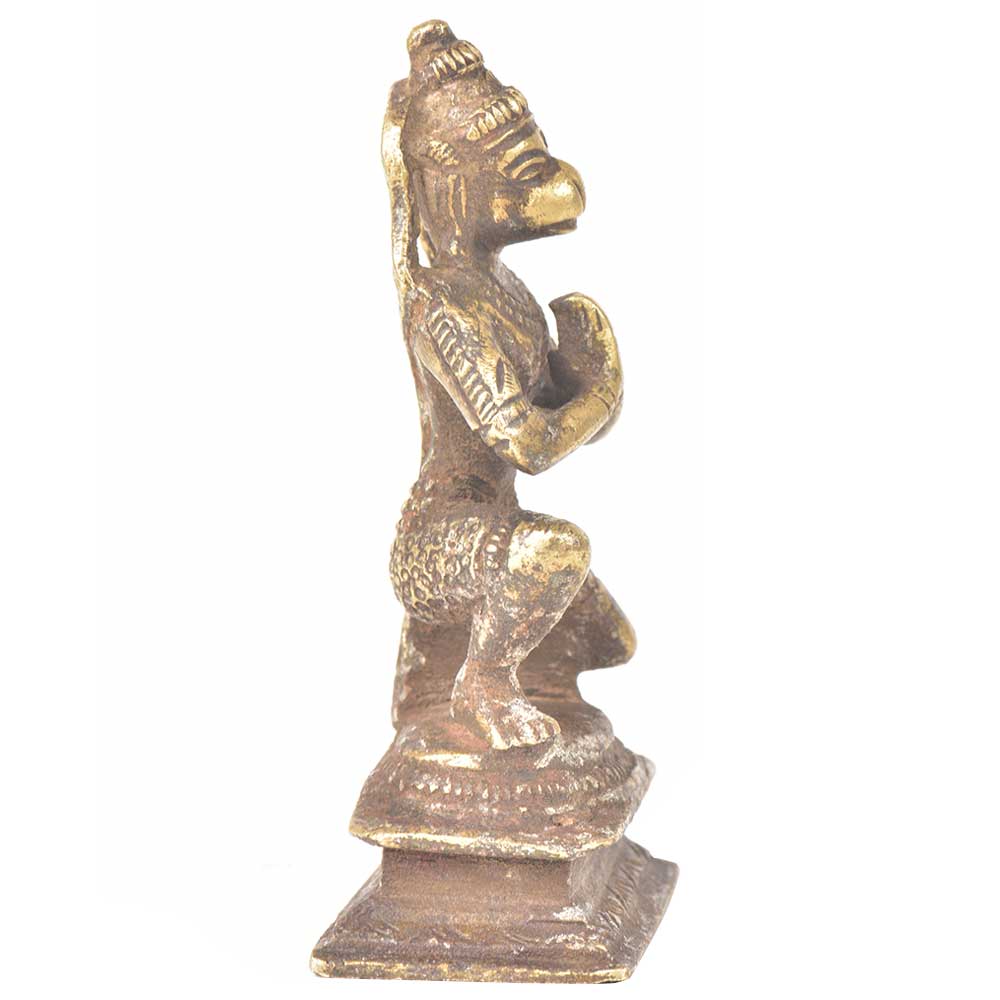 Statue of hanuman sitting on a raised platform joining his hands. This figurine of brass is made by the craftsmen and this figurine has a rustic look which makes it more beautiful.