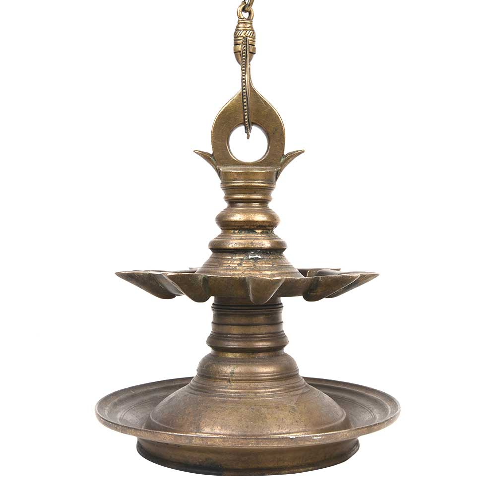 Hanging South Indian Bronze Oil Lamps. Used South Indian Oil Lamp. Made by Lost Wax Process. It Comes Along with the Bronze Chain. Adds Spiritual Flavor to You Decor. Vegetable Oil, Mustard Oil or Desi Ghee can be Use to Light the Lamp with Cotton Wicks.