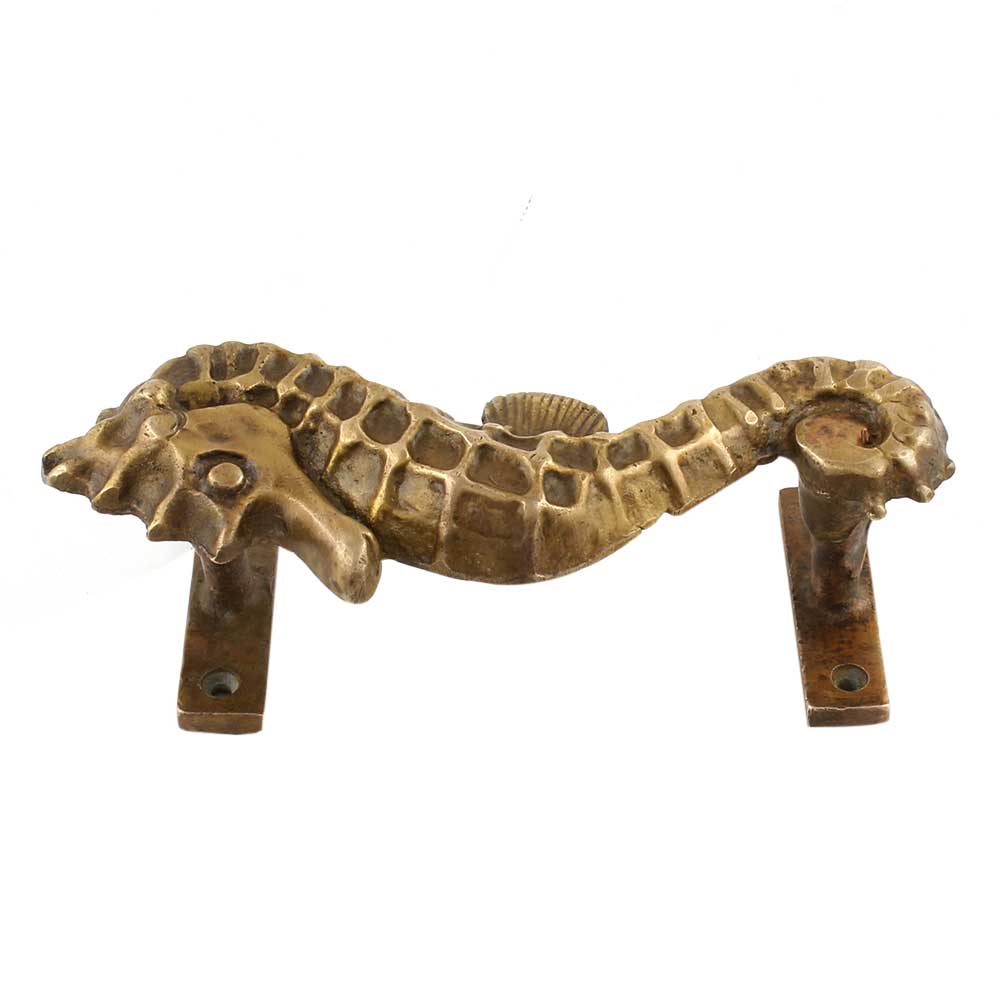 The seahorse brass door handles are beautifully detailed and constructed of high-quality brass. The seahorse's body curvature makes the appropriate handle shape, and they adhere to the wall or door with a scallop shell. Ideal for a set of internal doors in a bedroom or living room or on the front door of a beach-themed home.