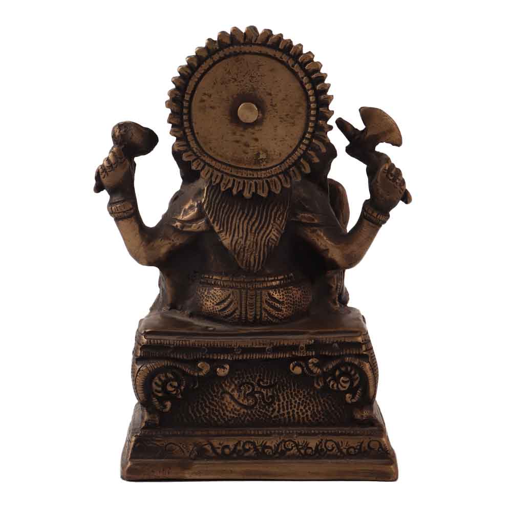 An antique brass statue of Lord Ganesha or Ganapati for home and office decoration. This statue depicts the seated Lord Ganesha on a throne with four arms. Lord Ganesha is one of the most important deities worshipped in Hinduism, son of Lord Shiva and Goddess Parvati. Place this statue in your prayer room to create an ethnic flair and spread positive energy in the house. Keeping the statue of Lord Ganesha spreads positive energy in the house and brings wealth, prosperity and happiness in your life. An ideal gift for any special and festive occasion for your family, friends and relatives.