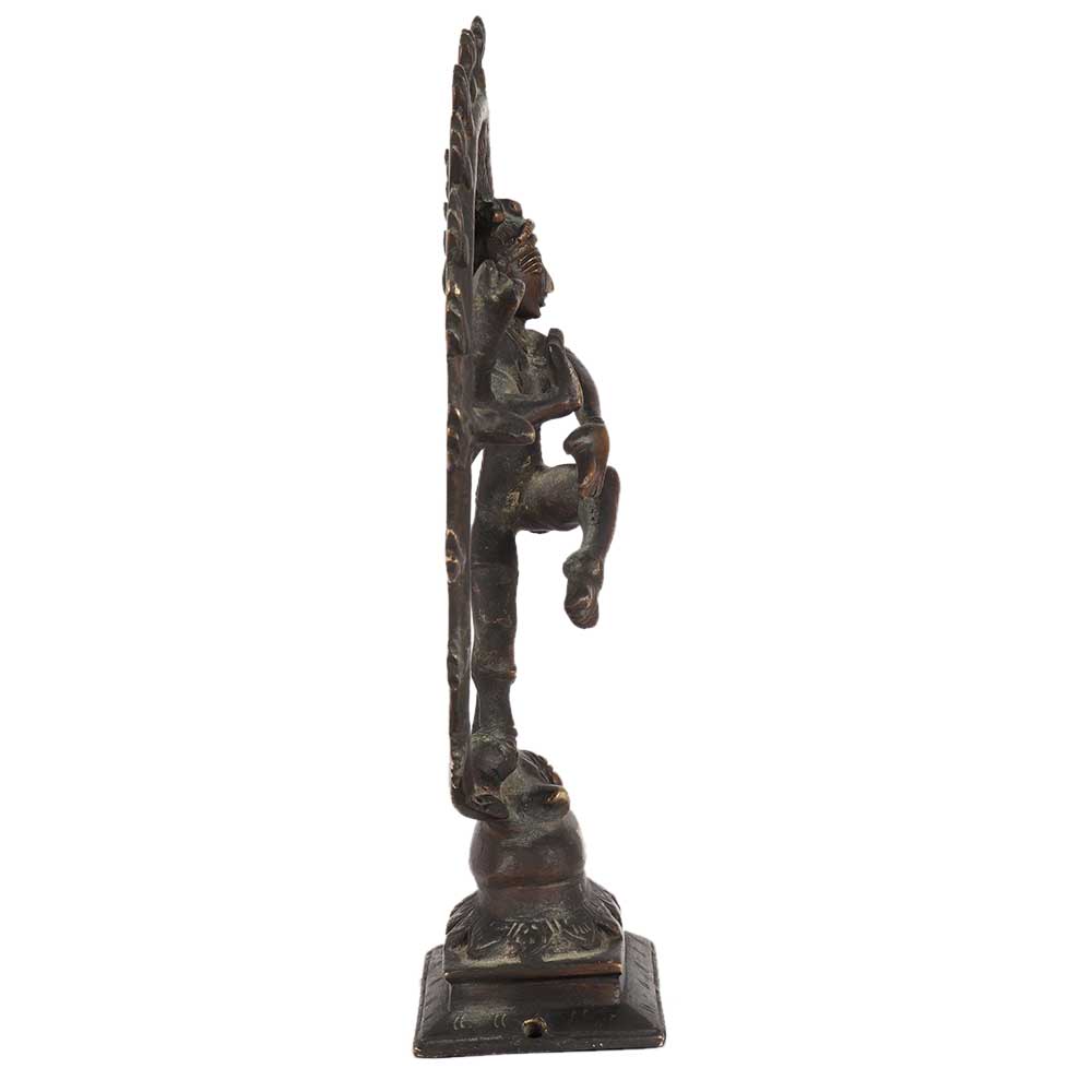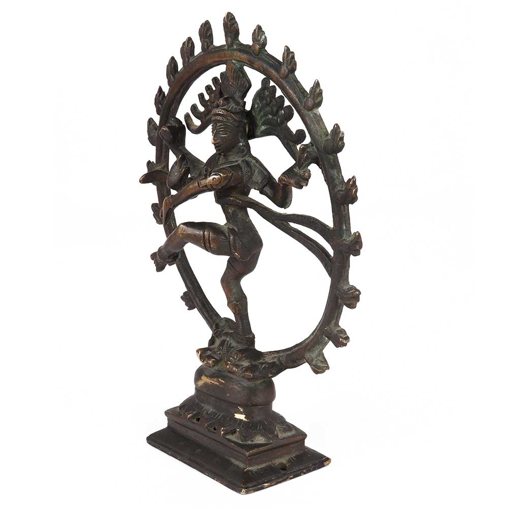 This handcrafted brass Natraja represents Shiva dancing in one of the Natya Shastra positions, carrying Agni or fire in his left back palm and gajahasta or dandahasta mudra in his front hand. The swirling hair, which spreads out in thin strands as a fan behind his head, represents the energy of the intense dance. The Lord Shiva dancing is known as the tandavam.