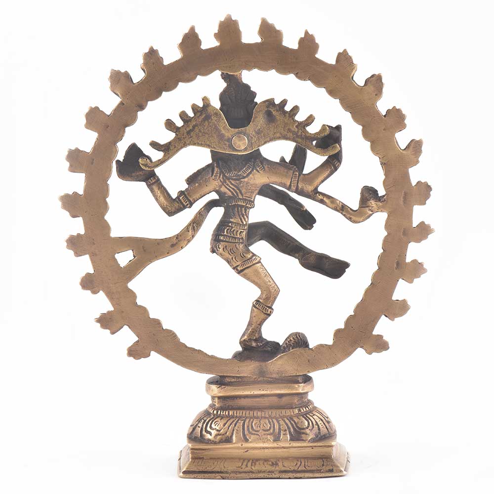 This is a very beautiful handmade brass statue of lord shiva depicted as Natraja the dancing god. The dance signifies putting an end to this exhausted world and creating a new world through lord Brahma who is responsible for the creation of the universe. In this statue lord shive is dancing With one leg on the demon and the other is lifted with a background of ring of flames. In one hand he holds the damru and the other is in abhayamudra mudra.