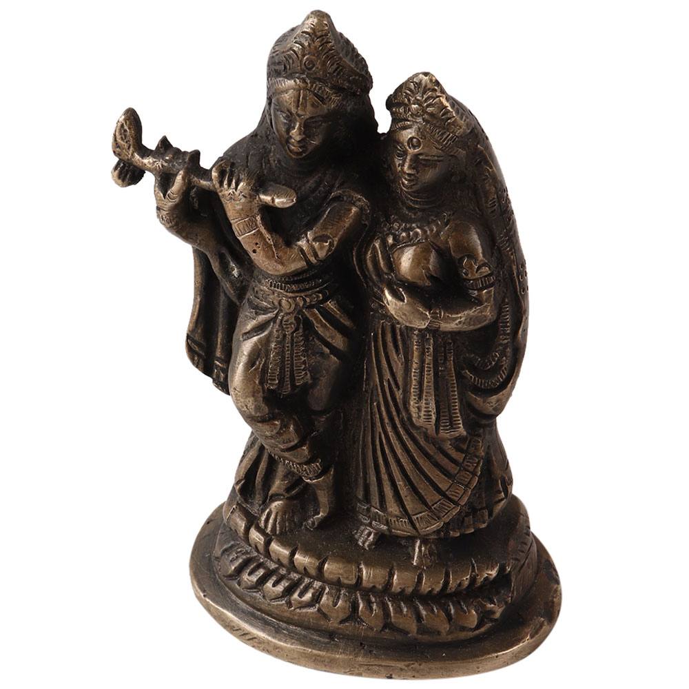 Add a tempting look to your prayer room with this beautiful handcrafted brass statue of Radha Krishna. This statue is perfectly carved from high quality brass using ancient methods. This statue depicts Lord Krishna playing flute with his right leg crossed is facing his left leg and Goddess Radha is standing beside him. Display this handcrafted piece in your prayer room to see its incredible impact in your life. In Hinduism, praying to Radha and Krishna increases love between couples and brings prosperity to the home. An ideal gift for your loved ones.