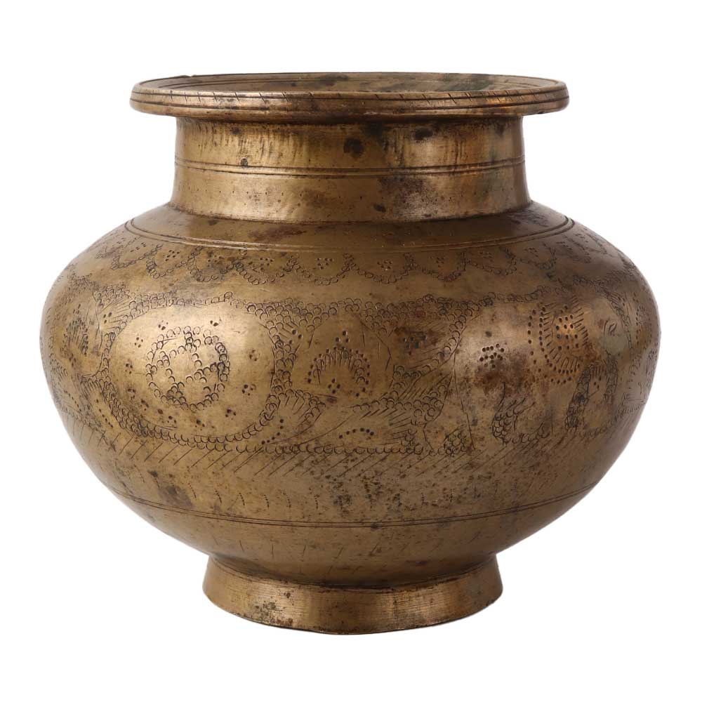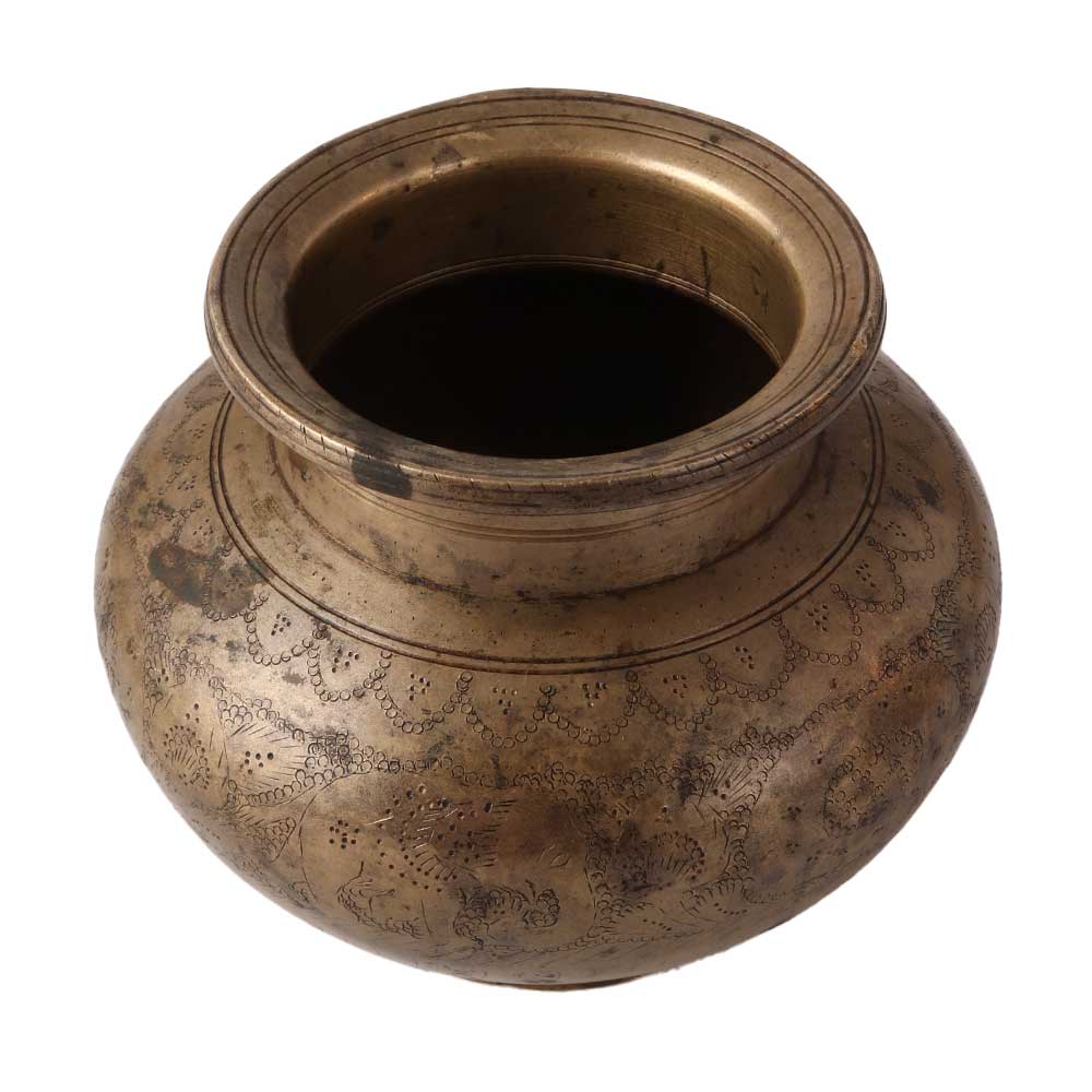 This water lota, or pot, is made of fine brass metal and is shaped like a typical cylindrical pot. This hand-made brass lota has intricate carving all around the pot that gives it a very traditional appearance. The best uses for it are for collection, home décor, and gift-giving to loved ones and acquaintances. It is believed that the Kamandal has spiritual significance and is used for purification rituals, meditation, and other spiritual practices. Due to its age, rarity, intricate design and cultural significance, a brass water Kamandal pot is a highly sought-after and valuable item. It is also considered as a sacred object and is often passed down as an heirloom.