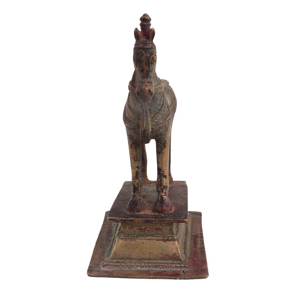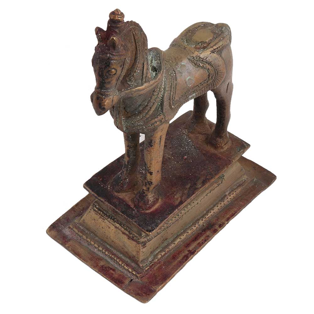 Brass Standing Horse Statue On A High Platform is a perfect example of expert craftsmanship of master craftsmen of ancient India. Home decoration statue, showpiece for the study table, office desk, graduation gift and souvenir for genuine horse lovers. It has a lovely patina finish.